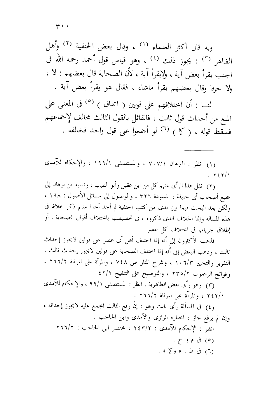 وبه قال أكثر العلماء، وقال بعض الحنفية وأهل الظاهر: يجوز ذلك، وهو قياس قول أحمد رحمه الله في الجنب يقرأ بعض آية، ولا يقرأ آية، لأن الصحابة قال بعضهم: لا، ولا حرفاً وقال بعضهم يقرأ ما شاء، فقال هو يقرأ بعض آية.