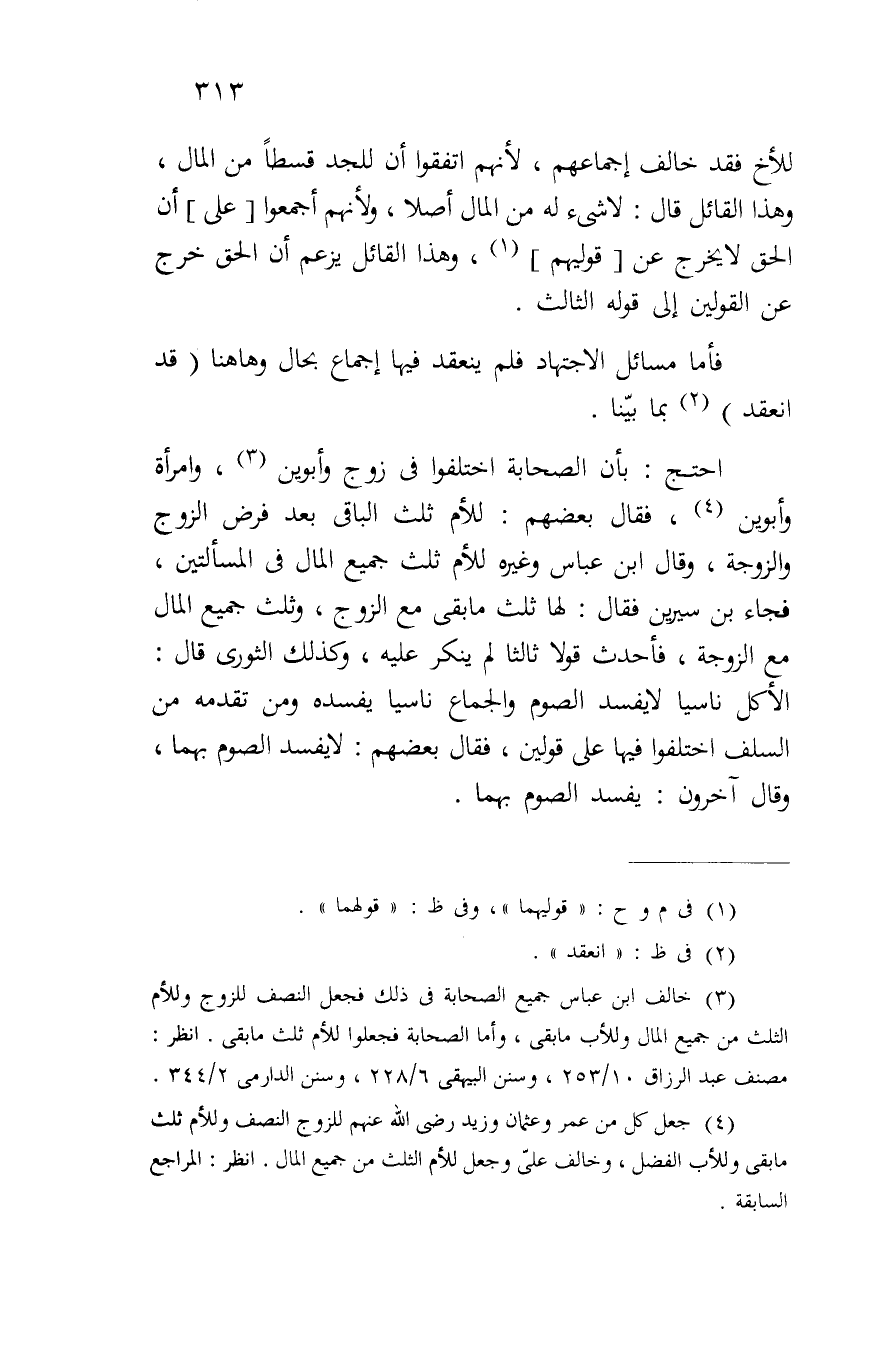 احتج: بأن الصحابة اختلفوا في زوج وأبوين، وامرأة وأبوين، فقال بعضهم: للأم ثلث الباقي بعد فرض الزوج والزوجة، وقال ابن عباس وغيره للأم ثلث جميع المال في المسألتين، فجاء بن سيرين فقال: لها ثلث ما بقي مع الزوج، وثلث جميع المال مع الزوجة، فأحدث قولاً ثالثاً لم ينكر عليه، وكذلك الثوري قال: الأكل ناسياً لا يفسد الصوم والجماع ناسياً يفسده ومن تقدمه من السلف اختلفوا فيها على قولين، فقال بعضهم: لا يفسد الصوم بهما، وقال آخرون: يفسد الصوم بهما.