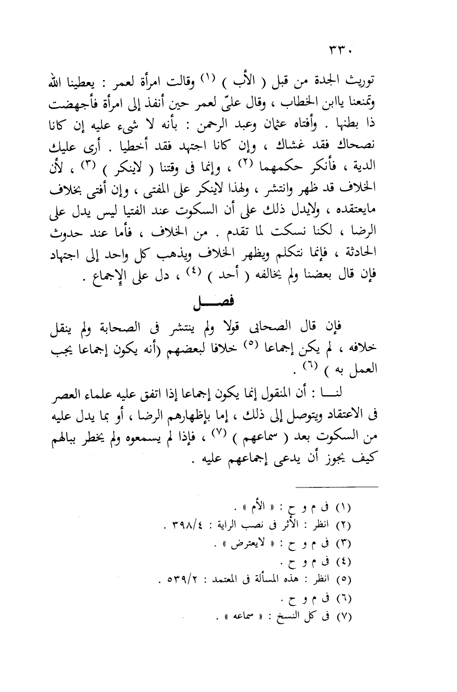 توريث الجدة من قبل (الأب) وقالت امرأة لعمر: يعطينا الله وتمنعنا يا ابن الخطاب، وقال علي لعمر حين أنفذ إلى امرأة فأجهضت ذا بطنها. وأفتاه عثمان وعبد الرحمن: بأنه لا شيء عليه إن كانا نصحاك فقد غشاك، وإن كانا اجتهد فقد أخطيا. أرى عليك الدية، فأنكر حكمهما، وإنما في وقتنا (لا ينكر) لأن الخلاف قد ظهر وانتشر، ولهذا لا ينكر على المفتي، وإن أفتى بخلاف ما يعتقده، ولا يدل ذلك على أن السكوت عند الفتيا ليس يدل على الرضا، لكنا نسكت لما تقدم. من الخلاف، فأما عند حدوث الحادثة، فإنما نتكلم ويظهر الخلاف ويذهب كل واحد إلى اجتهاد فإن قال بعضنا ولم يخالفه (أحد) دل على الإجماع.