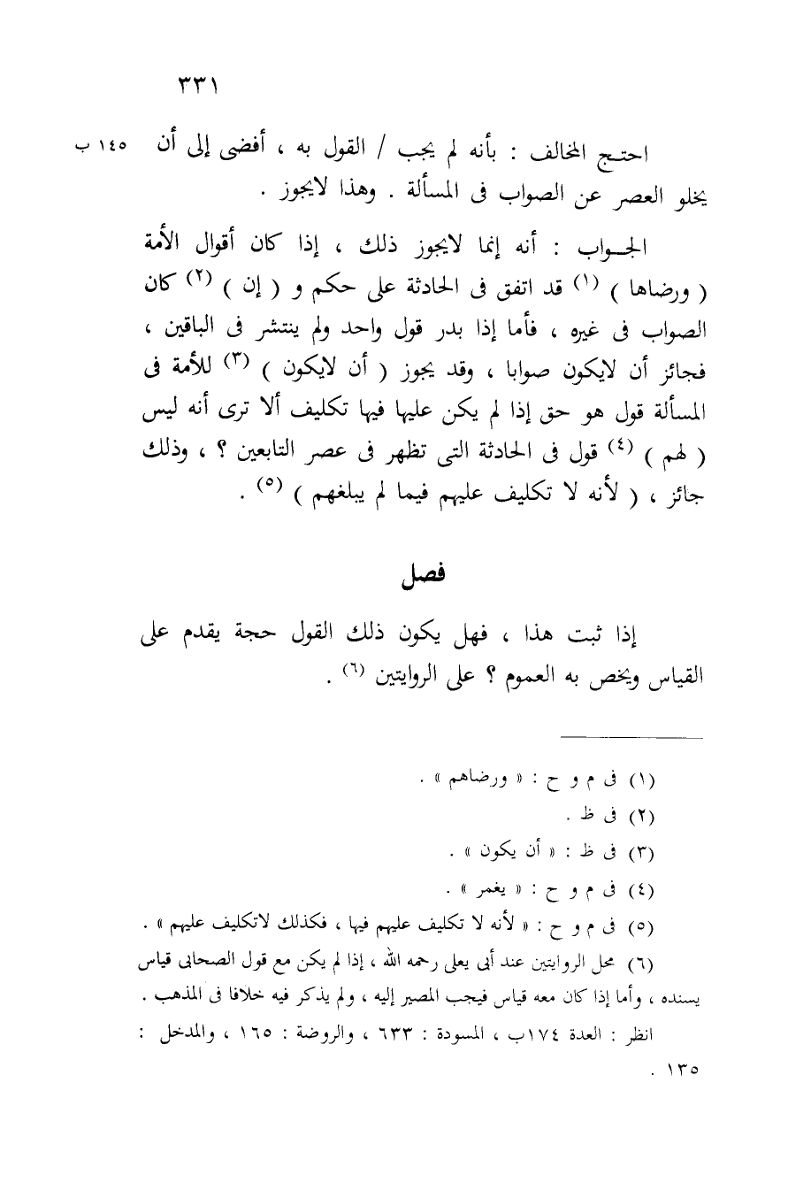 الجواب: أنه إنما لا يجوز ذلك، إذا كان أقوال الأمة (ورضاها) قد اتفق في الحادثة على حكم و (إن) كان الصواب في غيره، فأما إذا بدر قول واحد ولم ينتشر في الباقين، فجائز أن لا يكون صواباً، وقد يجوز (أن لا يكون) للأمة في المسألة قول هو حق إذا لم يكن عليها فيها تكليف ألا ترى أنه ليس (لهم) قول في الحادثة التي تظهر في عصر التابعين؟ وذلك جائز، (لأنه لا تكليف عليهم فيما لم يبلغهم).