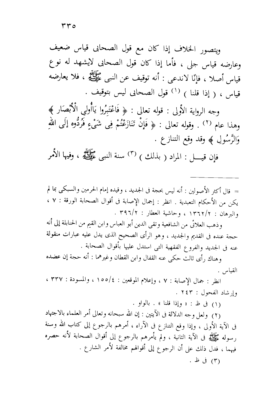 ويتصور الخلاف إذا كان مع قول الصحابي قياس ضعيف وعارضه قياس جلي، فأما إذا كان قول الصحابي لا يشهد له نوع قياس أصلاً، فإنا لا ندعي: أنه توقيف عن النبي صلى الله عليه وسلم، فلا يعارضه قياس، (إذا قلنا) قول الصحابي ليس بتوقيف.