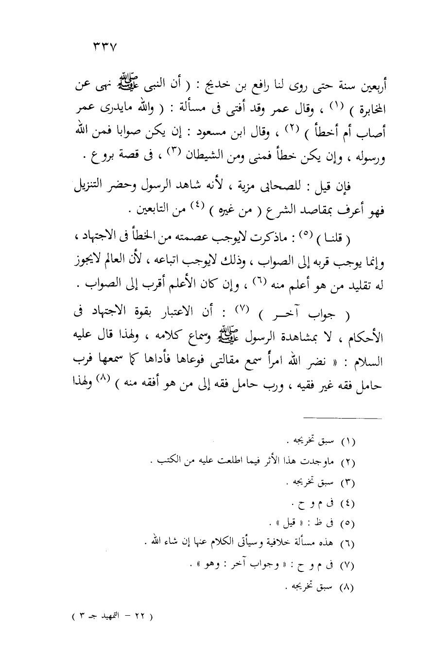 أربعين سنة حتى روى لنا رافع بن خديج: (أن النبي صلى الله عليه وسلم نهى عن المخابرة)، وقال عمر وقد أفتى في مسألة: (والله ما يدري عمر أصاب أم أخطأ)، وقال ابن مسعودك: إن يكن صواباً فمن الله ورسوله، وإن يكن خطأ فمني ومن الشيطان، في قصة بروع.