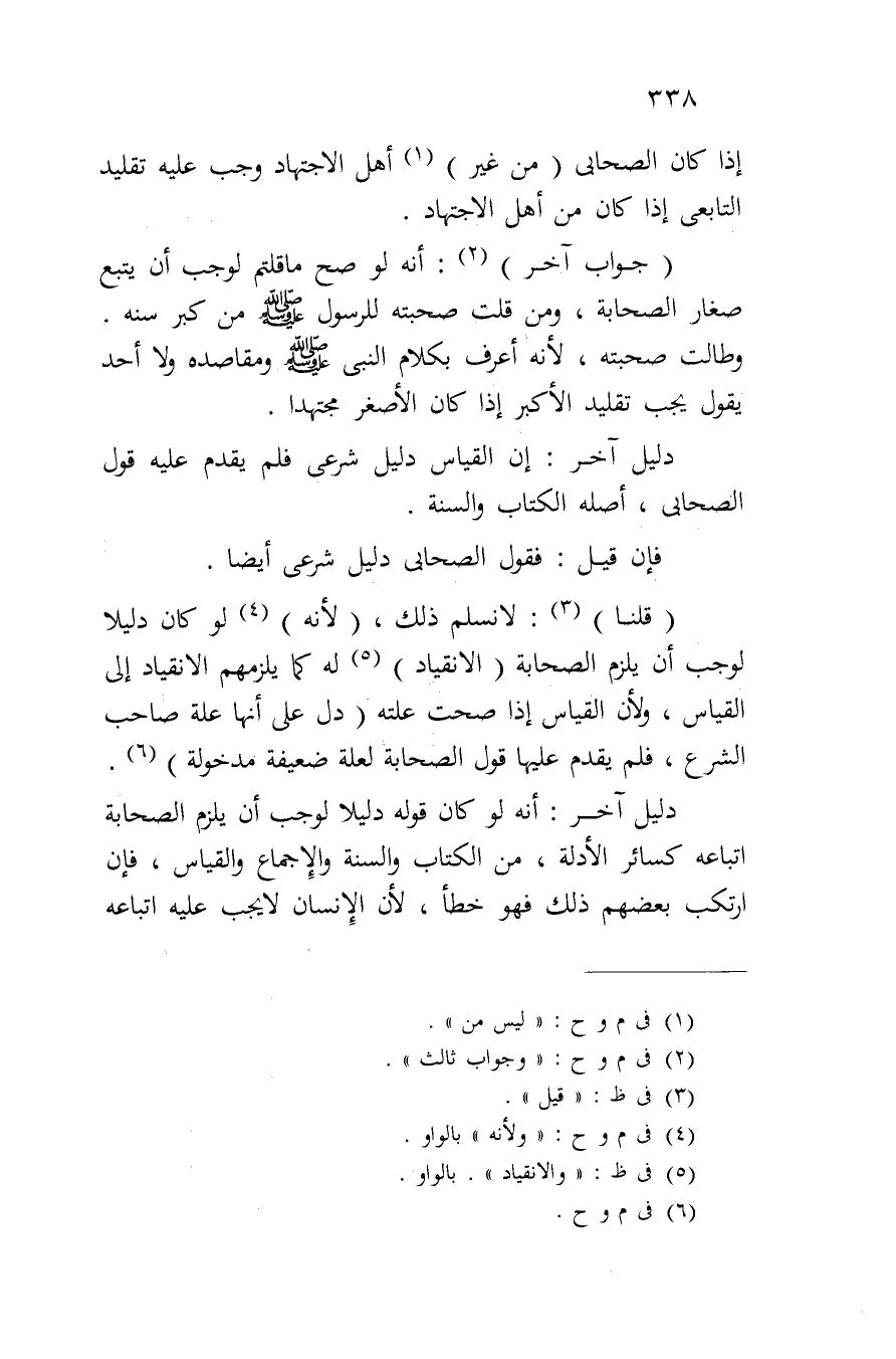 (جواب آخر): أنه لو صح ما قلتم لوجب أن يتبع صغار الصحابة، ومن قلت صحبته للرسول صلى الله علي هوسلم من كبر سنه. وطالت صحيته، لأنه أعرف بكلام النبي صلى الله عليه وسلم ومقاصده ولا أحد يقول يجب تقليد الأكبر إذا كان الأصغر مجتهداً.
