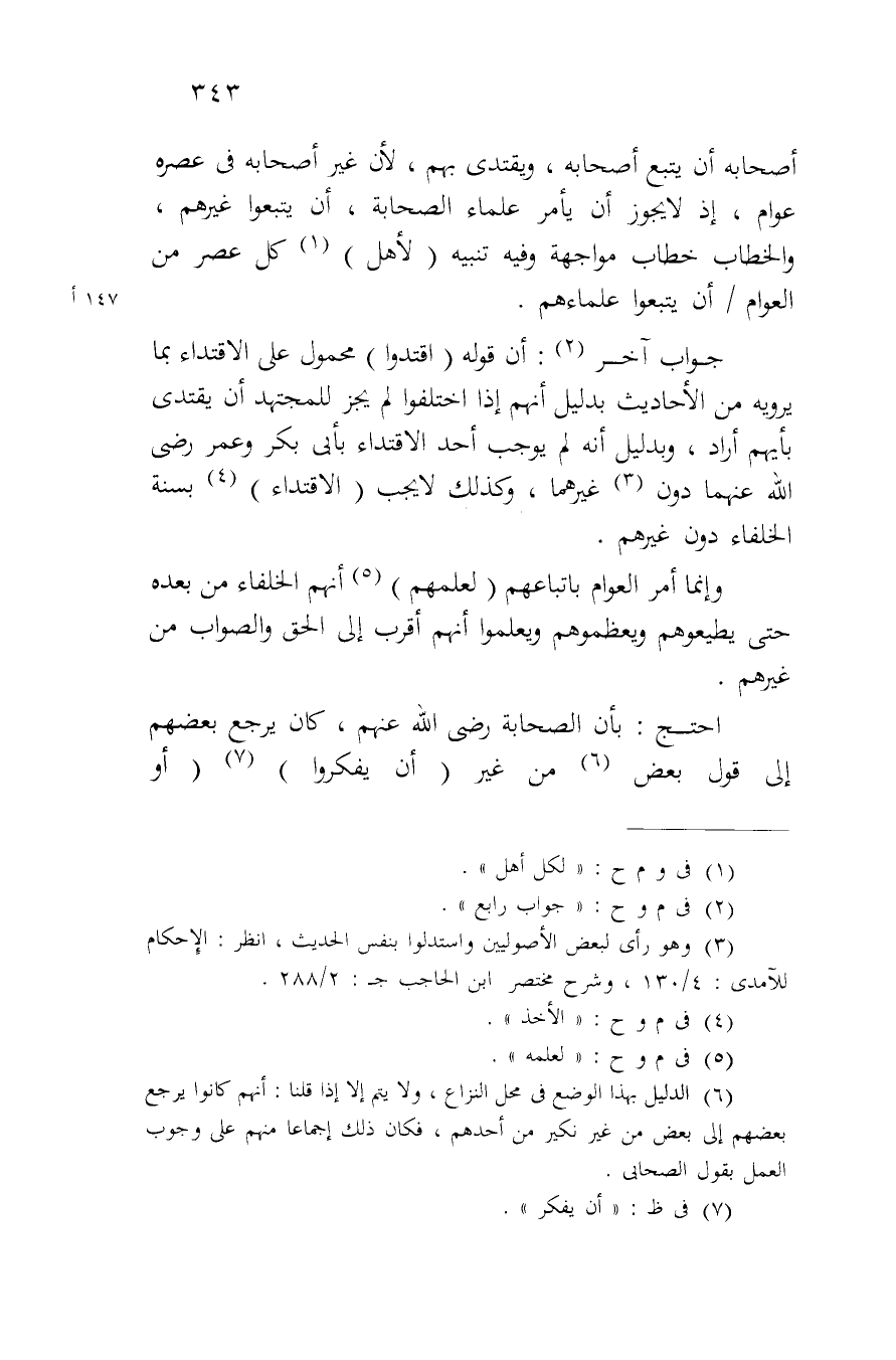 أصحابه أن يتبع أصحابه، ويقتدي بهم، لأن غير أصحابه في عصره عوام، إذ لا يجوز أن يأمر علماء الصحابة، أن يتبعوا غيرهم، والخطاب خطاب مواجهة وفيه تنبيه (لأهل) كل عصر من العوام/ أن يتبعوا علماءهم.