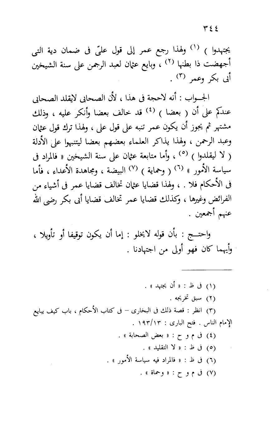 يجتهدوا) ولهذا رجع عمر إلى قول علي في ضمان دية التي أجهضت ذا بطنها، وبايع عثمان لعبد الرحمن على سنة الشيخين أبي بكر وعمر.