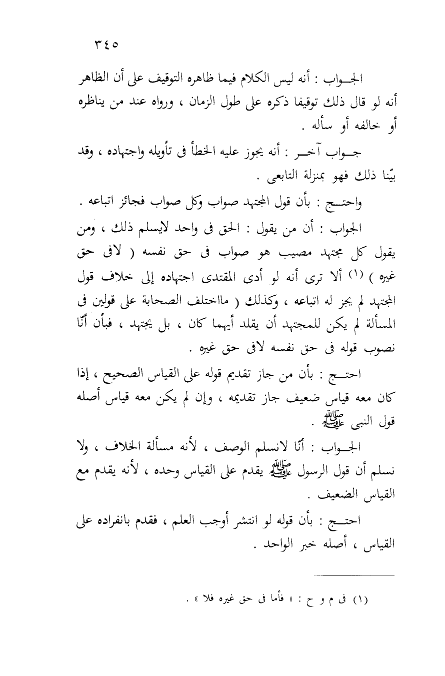 الجواب: أن من يقول: الحق في واحد لا يسلم ذلك، ومن يقول كل مجتهد مصيب هو صواب في حق نفسه (لا في حق غيره) ألا ترى أنه لو أدى المقتدي اجتهاده إلى خلاف قول المجتهد لم يجز له اتباعه، وكذلك (ما اختلف الصحابة على قولين في المسألة لم يكن للمجتهد أن يقلد أيهما كان، بل يجتهد، فبأن أنا نصوب قوله في حق نفسه لا في حق غيره.