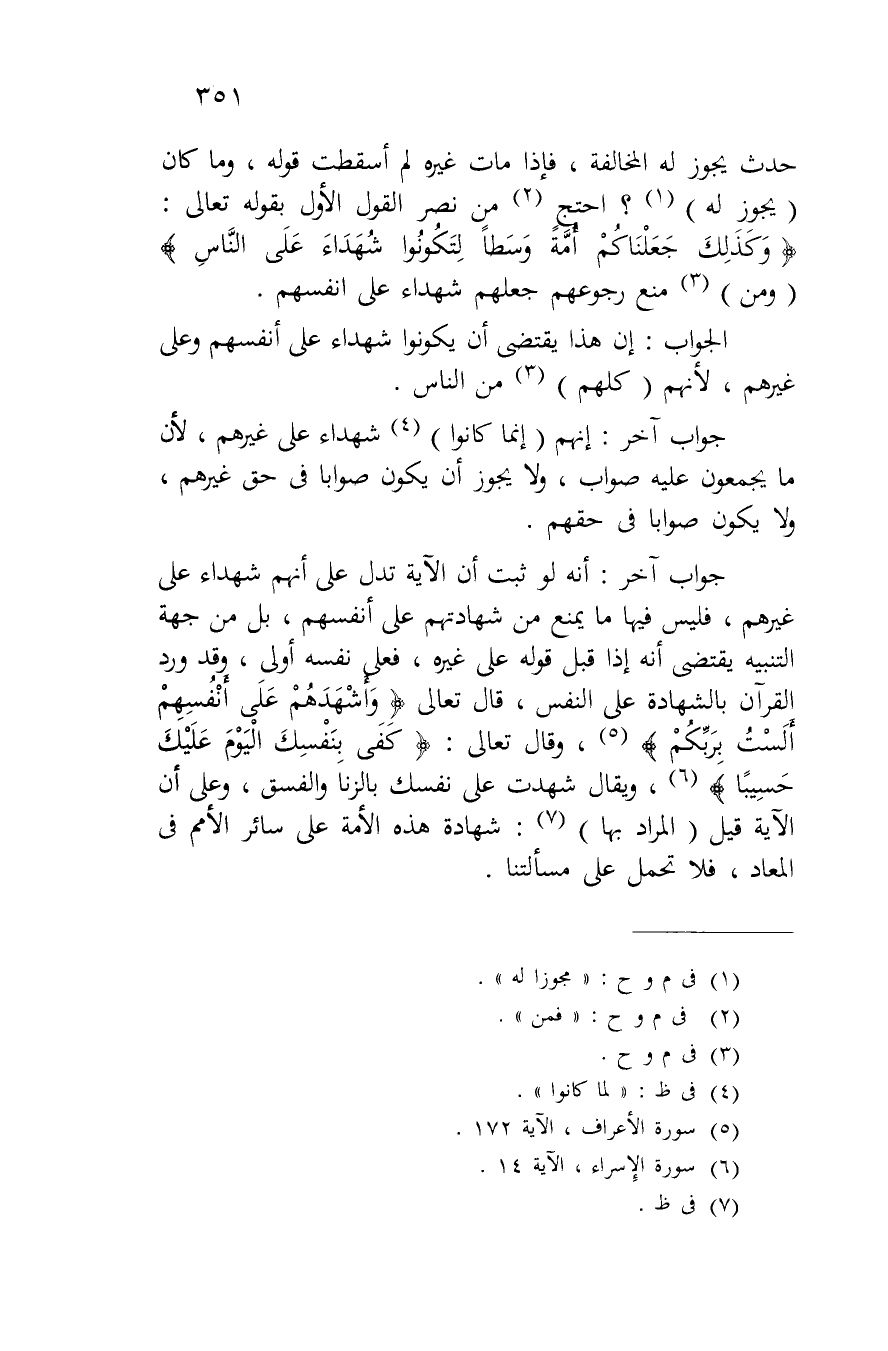 حدث يجوز له المخالفة، فإذا مات غيره لم أسقطت قوله، وما كان (يجوز له)؟ احتج من نصر القول الأول بقوله تعالى: {وَكَذَلِكَ جَعَلْنَاكُمْ أُمَّةً وَسَطاً لِتَكُونُوا شُهَدَاءَ عَلَى النَّاسِ} (ومن) منع رجوعهم جعلهم شهداء على أنفسهم.