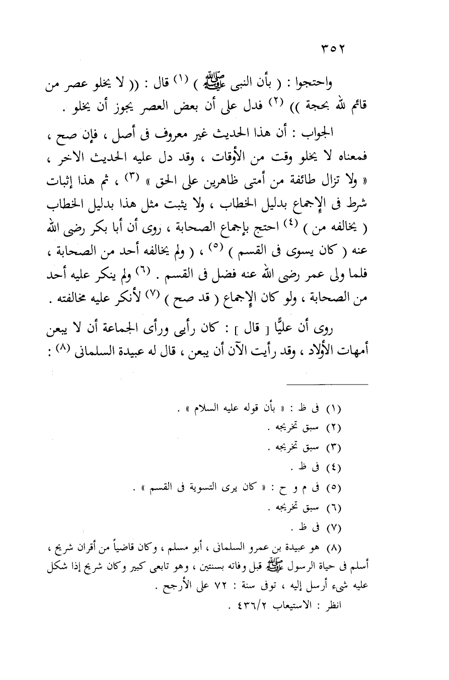 الجواب: أن هذا الحديث غير معروف في أصل، فإن صح، فمعناه لا يخلو وقت من الأوقات، وقد دل عليه الحديث الآخر، "ولا تزال طائفة من أمتي ظاهرين على الحق"، ثم هذا إثبات شرط في الإجماع بدليل الخطاب، ولا يثبت مثل هذا بدليل الخطاب (يخالفه من) احتج بإجماع الصحابة، روى أن أبا بكر رضي الله عنه (كان يسوى في القسم)، (ولم يخالفه أحد من الصحابة، فلما ولى عمر رضي الله عنه فضل في القسم. ولم ينكر عليه أحد من الصحابة، ولو كان الإجماع (قد صح) لأنكر عليه مخالفته.