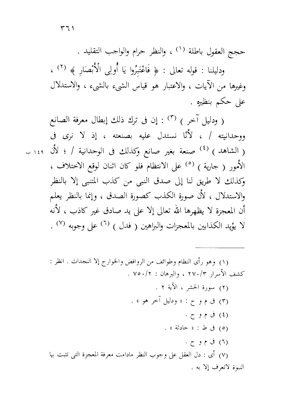 (ودليل آخر): إن في ترك ذلك إبطال معرفة الصانع ووحدانيته/ لأنا نستدل عليه بصنعته، إذ لا نرى في (الشاهد) صنعة بغير صانع وكذلك في الوحدانية؛ لأن الأمور (جارية) على الانتظام فلو كان اثنان لوقع الاختلاف، وكذلك لا طريق لنا إلى صدق النبي من كذب المتنبي إلا بالنظر والاستدلال، لأن صورة الكذب كصورة الصدق، وإنما بالنظر يعلم أن المعجزة لا يظهرها الله تعالى إلا على يد صادق غير كاذب، لأنه لا يؤيد الكذابين بالمعجزات والبراهين (فدل) على وجوبه.