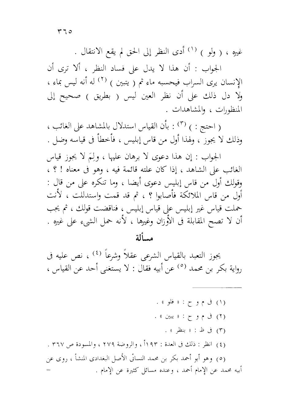 الجواب: إن هذا دعوى لا برهان عليها، ولم لا يجوز قياس الغائب على الشاهد، إذا كان علته قائمة فيه، وهو في معناه؟، وقولك أول من قاس إبليس دعوى أيضاً، وما تنكره على من قال: أول من قاس الملائكة فأصابوا؟ ثم قد قمت واستدللت لأنت حملت قياس غير إبليس على قياس إبليس، فناقضت قولك، ثم يجب أن لا تصح المقابلة في الأوزان وغيرها، لأنه حمل الشيء على غيره.