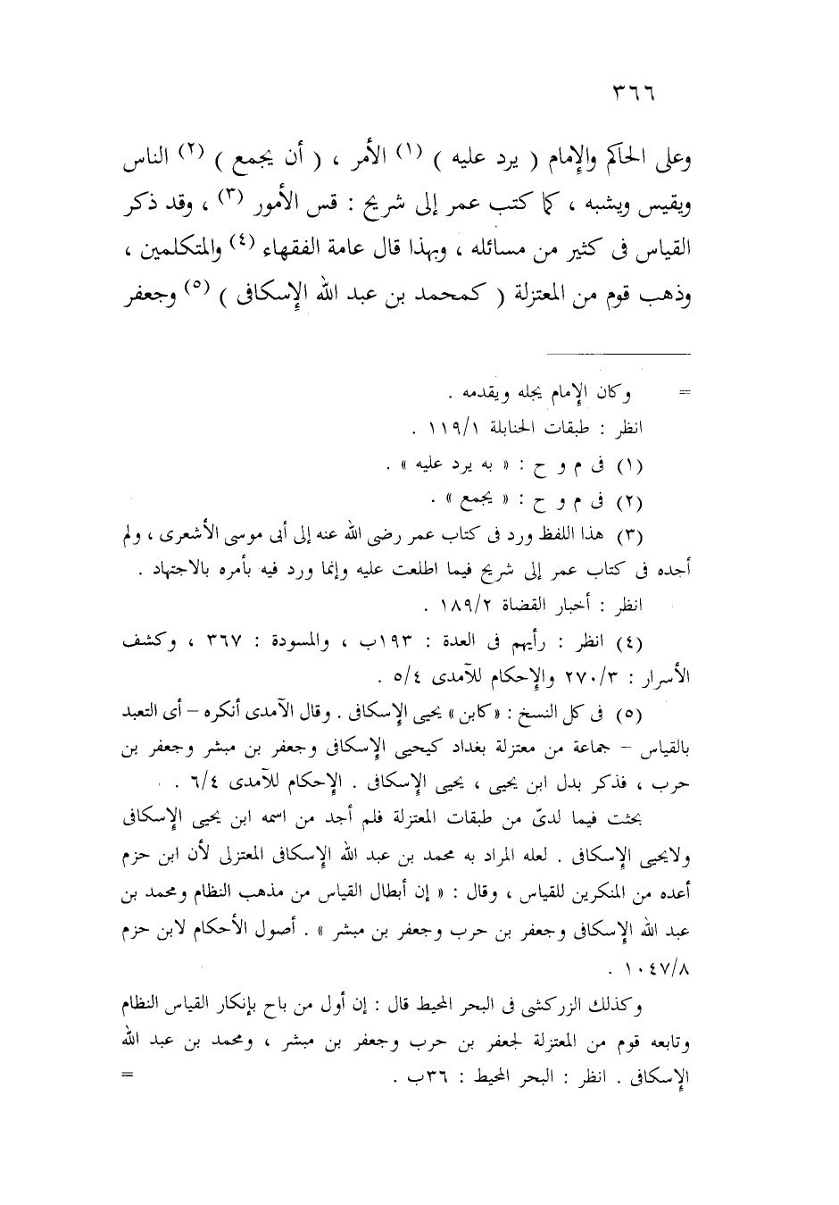 وعلى الحاكم والإمام (يرد عليه) الأمر، (أن يجمع) الناس ويقيس ويشبه، كما كتب عمر إلى شريح: قس الأمور، وقد ذكر القياس في كثير من مسائله، وبهذا قال عامة الفقهاء والمتكلمين، وذهب قوم من المعتزلة (كمحمد بن عبد الله الإسكافي) وجعفر