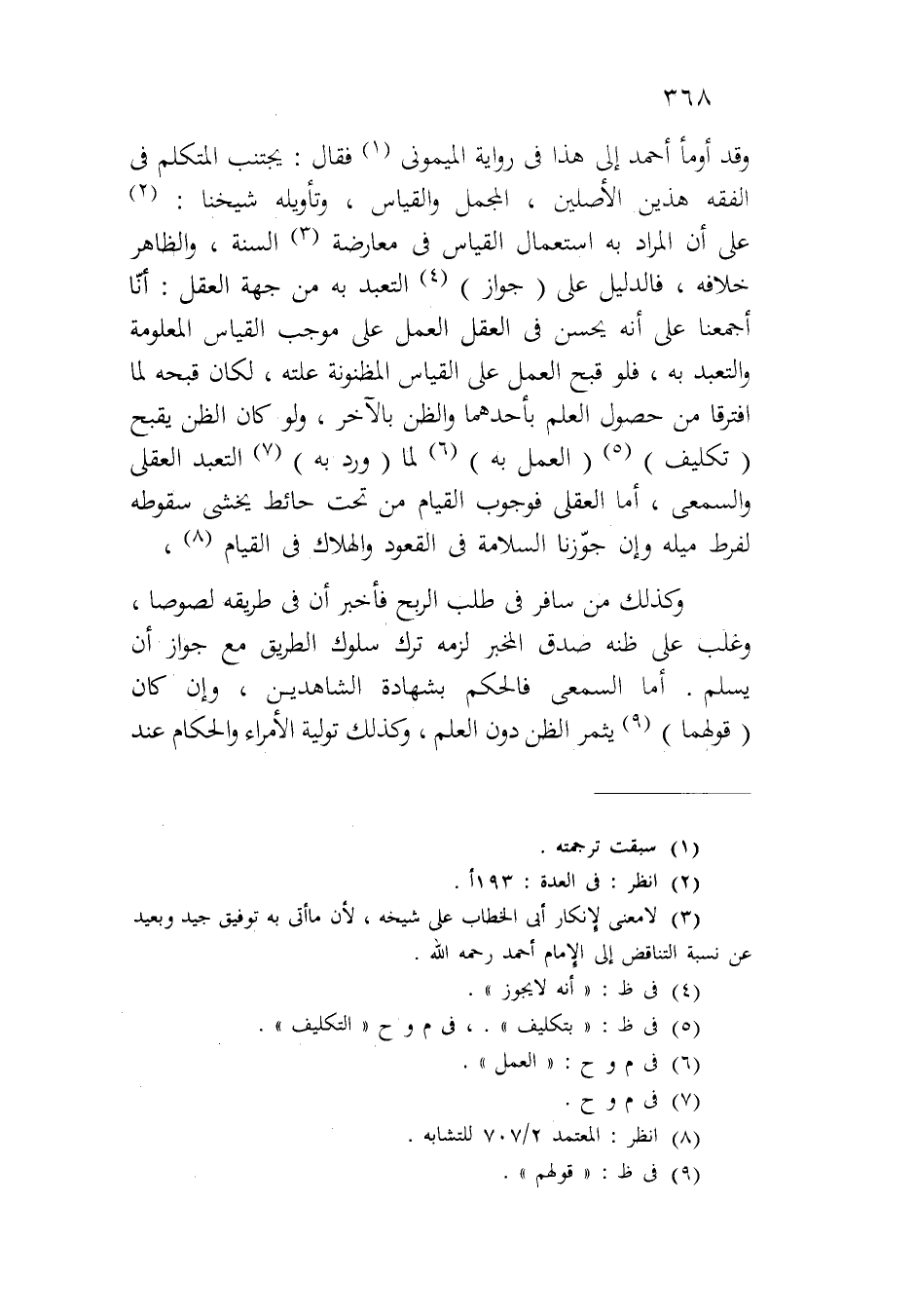 وقد أومأ أحمد إلى هذا في رواية الميموني فقال: يجتنب المتكلم في الفقه هذين الأصلين، المجمل والقياس، وتأويله شيخنا: على أن المراد به استعمال القياس في معارضة السنة، والظاهر خلافه، فالدليل على (جواز) التعبد به من جهة العقل: أنا أجمعنا على أنه يحسن في العقل العمل على موجب القياس المعلومة والتعبد به، فلو قبح العمل على القياس المظنونة علته، لكان قبحه لما افترقا من حصول العلم بأحدهما والظن بالآخر، ولو كان الظن يقبح (تكليف) (العمل به) لما (ورد به) التعبد العقلي والسمعي، أما العقل فوجوب القيام من تحت حائط يخشى سقوطه لفرط ميله وإن جوزنا السلامة في القعود والهلاك في القيام،