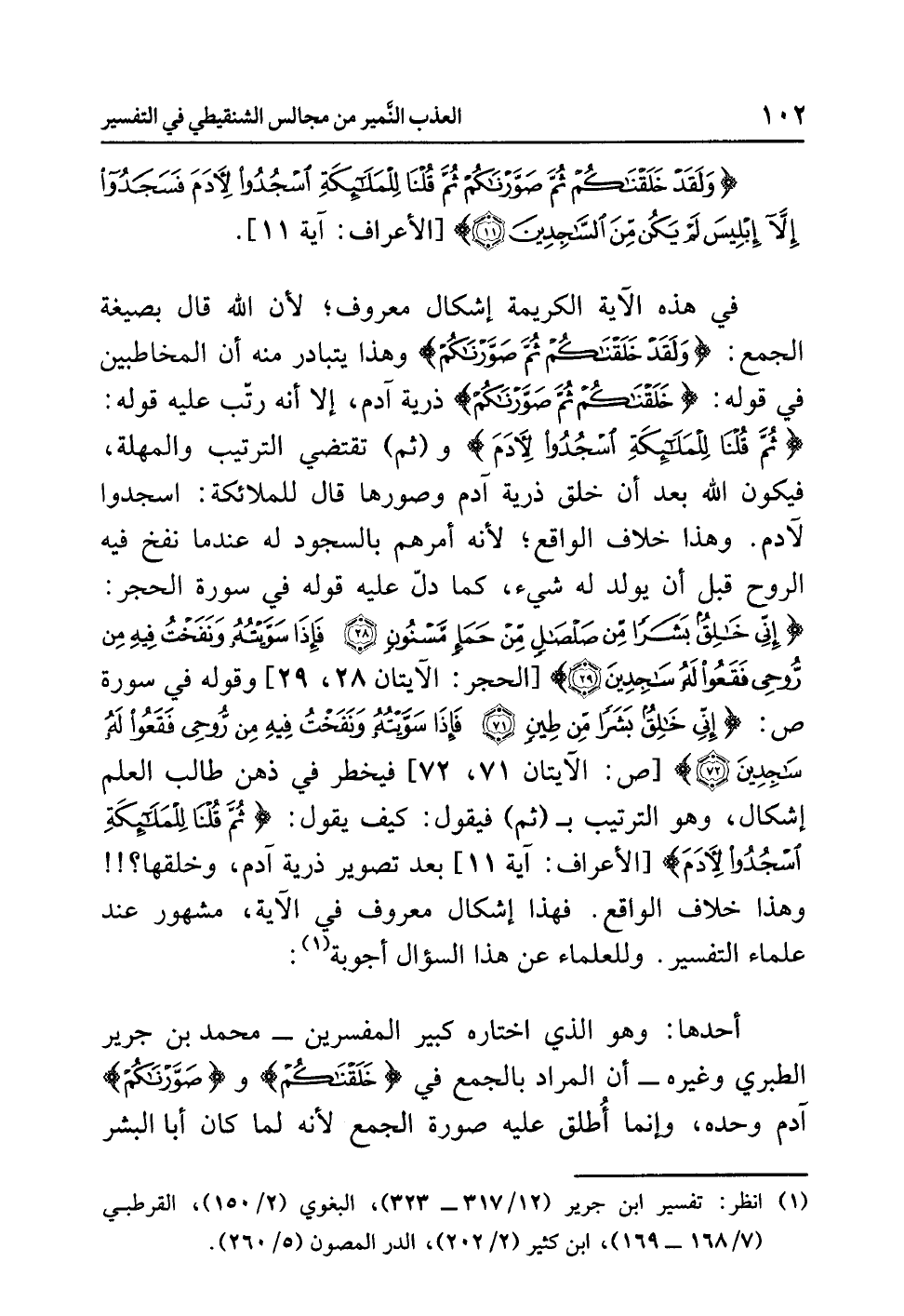 في هذه الآية الكريمة إشكال معروف؛ لأن الله قال بصيغة الجمع: {وَلَقَدْ خَلَقْنَاكُمْ ثُمَّ صَوَّرْنَاكُمْ} وهذا يتبادر منه أن المخاطبين في قوله: {خَلَقْنَاكُمْ ثُمَّ صَوَّرْنَاكُمْ} ذرية آدم، إلا أنه رتّب عليه قوله: {ثُمَّ قُلْنَا لِلْمَلآئِكَةِ اسْجُدُواْ لآدَمَ} و (ثم) تقتضي الترتيب والمهلة، فيكون الله بعد أن خلق ذرية آدم وصورها قال للملائكة: اسجدوا لآدم، وهذا خلاف الواقع؛ لأنه أمرهم بالسجود له عندما نفخ فيه الروح قبل أن يولد له شيء، كما دلّ عليه قوله في سورة الحجر: {إِنِّي خَالِقٌ بَشَراً مِّن صَلْصَالٍ مِّنْ حَمَإٍ مَّسْنُونٍ (28) فَإِذَا سَوَّيْتُهُ وَنَفَخْتُ فِيهِ مِن رُّوحِي فَقَعُواْ لَهُ سَاجِدِينَ (29)} [الحجر: الآيتان 28، 29] وقوله في سورة ص: {إِنِّي خَالِقٌ بَشَراً مِن طِينٍ (71) فَإِذَا سَوَّيْتُهُ وَنَفَخْتُ فِيهِ مِن رُّوحِي فَقَعُوا لَهُ سَاجِدِينَ (72)} [ص: الآيتان 71، 72] فيخطر في ذهن طالب العلم إشكال، وهو الترتيب بـ (ثم) فيقول: كيف يقول: {ثُمَّ قُلْنَا لِلْمَلآئِكَةِ اسْجُدُواْ} [الأعراف: آية 11] بعد تصوير ذرية آدم، وخلقها؟! وهذا خلاف الواقع، فهذا إشكال معروف في الآية، مشهور عند علماء التفسير، وللعلماء عن هذا السؤال أجوبة (¬1):