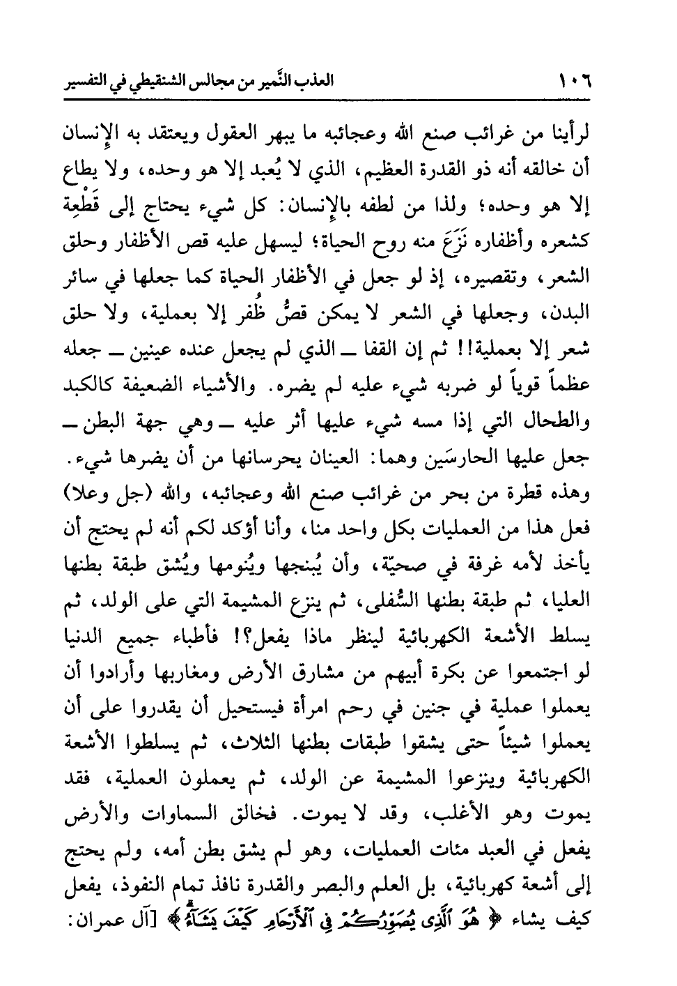 الله وعجائبه ما يبهر العقول ويعتقد به الإنسان أن خالقه ذو القدرة العظيم، الذي لا يُعبد إلا هو وحده، ولا يطاع إلا هو وحده؛ ولذا من لُطْفِهِ بالإنسان: كل شيء يحتاج إلى قَطْعِه كشعره وأظفاره نَزَعَ منه روح الحياة؛ ليسهل عليه قص الأظافر وحلق الشعر، وتقصيره؛ إذ لو جعل في الأظافر الحياة كما جعلها في سائر البدن، وجعلها في الشعر لا يمكن قصُّ ظُفر إلا بعملية، ولا حلق شعر إلا بعملية! ثم إن القفا -الذي لم يجعل عنده عينين- جعله عظماً قوياً لو ضربه شيء عليه لم يضره. والأشياء الضعيفة كالكبد والطحال التي إذا مسه شيء عليها أثر عليه - وهي جهة البطن - جعل عليها الحارسَين وهما العينان، يحرسانها مِنْ أَنْ يضرَّهَا شَيْء. وهذه قطرة من بحر من غرائب صنع الله وعجائبه، والله (جل وعلا) فعل هذا من العمليات بكل واحد منا، وأنا أؤكد لكم أنه لم يحتج أن يأخذ لأمه غرفة في صِحِّيّة (¬1)، وأن يُبنجها ويُنومها ويُشق طبقة بطنها العليا، ثم طبقة بطنها السُّفلى، ثم ينزع المشيمة التي على الولد، ثم يسلط الأشعة الكهربائية لينظر ماذا يفعل؟! فأطباء جميع الدنيا لو اجتمعوا عن بكرة أبيهم من مشارق الأرض ومغاربها وأرادوا أن يعملوا عملية في جنين في رحم امرأة فيستحيل أن يقدروا على أن يعملوا شيئاً حتى يشقوا طبقات بطنها الثلاث، ثم يسلطوا الأشعة الكهربائية وينزعوا المشيمة عن الولد، ثم يعملون العملية، فقد يموت وهو الأغلب، وقد لا يموت، فخالق السماوات والأرض يفعل في العبد مئات العمليات، وهو لم يشق بطن أمه، ولم يحتج إلى أشعة كهربائية، بل العلم والبصر والقدرة نافذ تمام النفوذ، يفعل كيف يشاء {هُوَ الَّذِي يُصَوِّرُكُمْ فِي الأَرْحَامِ كَيْفَ يَشَاءُ} [آل عمران:
