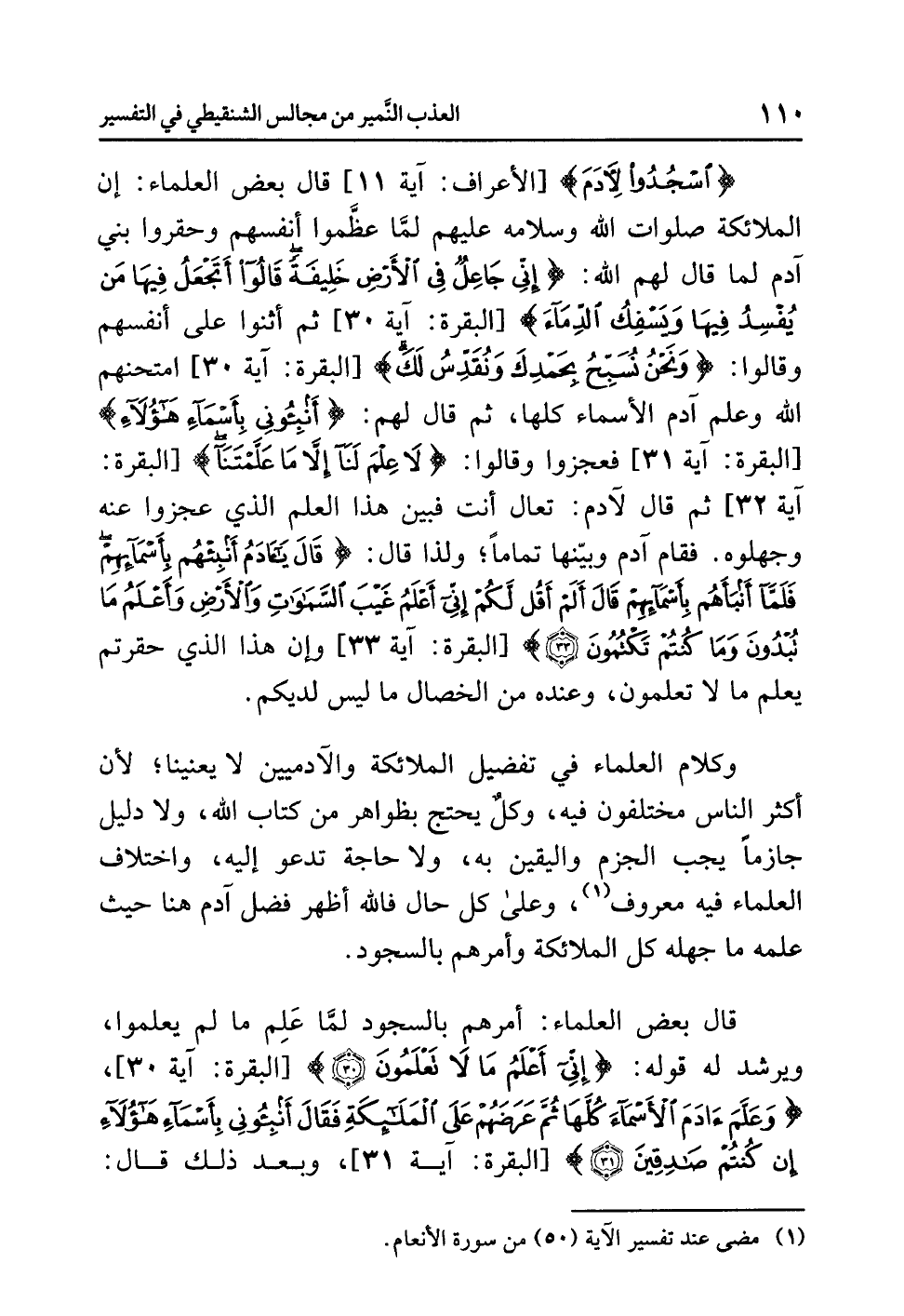 وكلام العلماء في تفضيل الملائكة والآدميين لا يعنينا؛ لأن أكثر الناس مختلفون فيه، وكلٌّ يَحْتَجُّ بِظَوَاهِر من كتاب الله، ولا دليل جازماً يجب الجزم واليقين به، ولا حاجة تدعو إليه، واختلاف العلماء فيه معروف (¬1)، وعلى كل حال فالله أظهر فضل آدم هنا حيث علمه ما جهله كل الملائكة وأمَرَهم بالسجود.
