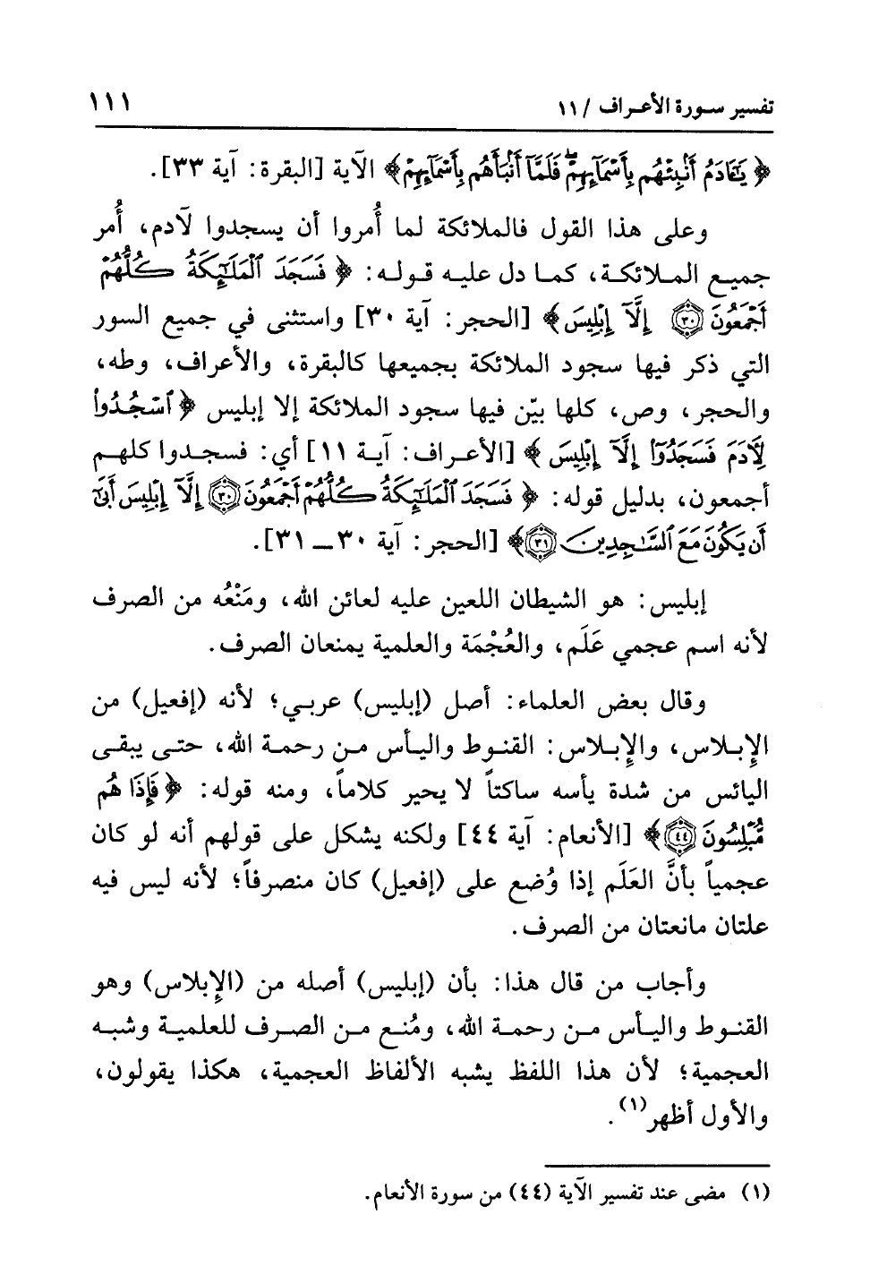 وأجاب من قال هذا: بأن (إبليس) أصله من (الإبلاس) وهو القنوط واليأس من رحمة الله، ومُنع من الصرف للعلمية وشبه العجمية؛ لأن هذا اللفظ يشبه الألفاظ العجمية، هكذا يقولون، والأول أظهر (¬1).