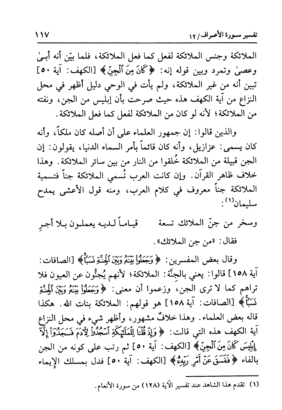 والذين قالوا: إن جمهور العلماء على أن أصله كان ملكاً، وأنه كان يسمى: عزازيل، وأنه كان قائماً بأمر السماء الدنيا، يقولون: إن الجن قبيلة من الملائكة خُلقوا من النار من بين سائر الملائكة، وهذا خلاف ظاهر القرآن، وإن كانت العرب تُسمي الملائكة جنّاً فتسمية الملائكة جنّاً معروف في كلام العرب، ومنه قول الأعشى يمدح سليمان (¬1):