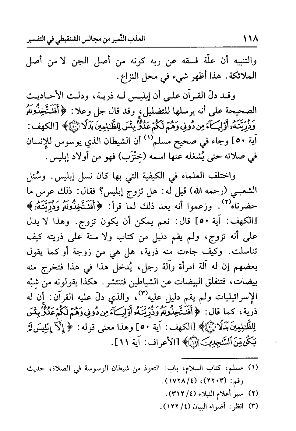 واختلف العلماء في الكيفية التي بها كان نسل إبليس، وسُئل الشعبي (رحمه الله) قيل له: هل تزوج إبليس؟ فقال: ذلك عرس ما حضرناه (¬2). وزعموا أنه بعد ذلك لما قرأ: {أَفَتَتَّخِذُونَهُ وَذُرِّيَّتَهُ} [الكهف: آية 50] قال: نعم يمكن أن يكون تزوج، وهذا لا يدل على أنه تزوج، ولم يقم دليل من كتاب ولا سنة على ذريته كيف تناسلت. وكيف جاءت منه ذرية، هل هي من زوجة أو كما يقول بعضهم إن له آلة امرأة وآلة رجل، يُدخل هذا في هذا فتخرج منه بيضات، فتنفلق البيضات عن الشياطين فتنتشر. هكذا يقولونه من شِبْه الإسرائيليات ولم يقم دليل عليه (¬3)، والذي دلّ عليه القرآن: أن له ذرية، كما قال: {أَفَتَتَّخِذُونَهُ وَذُرِّيَّتَهُ أَوْلِيَاء مِن دُونِي وَهُمْ لَكُمْ عَدُوٌّ بِئْسَ لِلظَّالِمِينَ بَدَلاً} [الكهف: آية 50] وهذا معنى قوله: {إِلاَّ إِبْلِيسَ لَمْ يَكُن مِّنَ السَّاجِدِينَ} [الأعراف: آية 11].