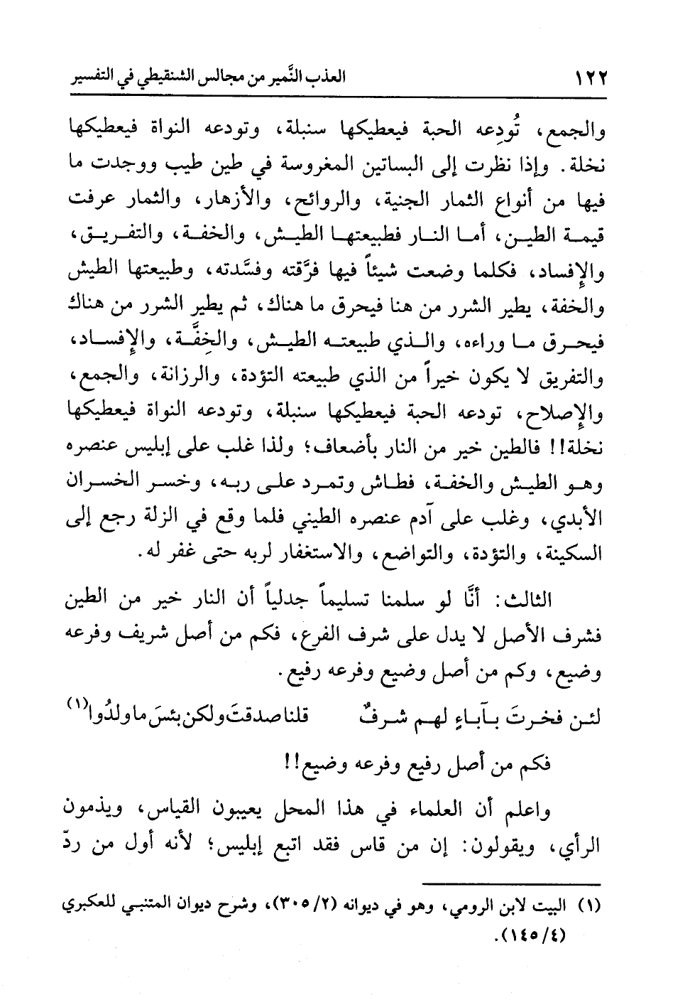 والجمع، تُودِعه الحبة فيعطيكها سنبلة، وتودعه النواة فيعطيكها نخلة، وإذا نظرت إلى البساتين المغروسة في طين طيب ووجدت ما فيها من أنواع الثمار الجنية، والروائح، والأزهار، والثمار عرفت قيمة الطين، أما النار فطبيعتها الطيش، والخفة، والتفريق، والإفساد، فكلما وضعت شيئاً فيها فرَّقته وفسَّدته، وطبيعتها الطيش والخفة، يطير الشرر من هنا فيحرق ما هناك، ثم يطير الشرر من هناك فيحرق ما وراءه، والذي طبيعته الطيش والخِفَّة والإفساد والتفريق لا يكون خيراً من الذي طبيعته التؤدة والرزانة والجمع والإصلاح، تودعه الحبة فيعطيكها سنبلة، وتودعه النواة فيعطيكها نخلة!! فالطين خير من النار بأضعاف؛ ولذا غلب على إبليس عنصره وهو الطيش والخفة، فطاش وتمرد على ربه، وخسر الخسران الأبدي، وغلب على آدم عنصره الطيني فلما وقع في الزلة رجع إلى السكينة والتؤدة والتواضع والاستغفار لربه حتى غفر له.