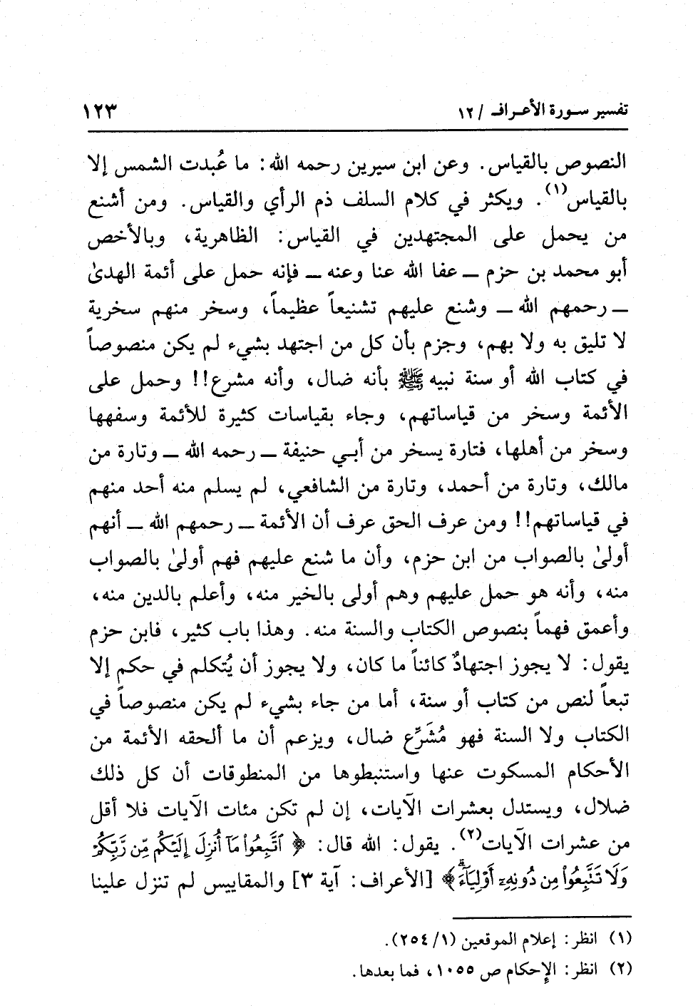 النصوص بالقياس. وعن ابن سيرين رحمه الله: ما عُبدت الشمس إلا بالقياس (¬1). ويكثر في كلام السلف ذَمّ الرَّأْيِ والقِيَاسِ. ومن أشنع من يحمل على المجتهدين في القياس: الظاهرية، وبالأخص أبو محمد بن حزم -عفا الله عنا وعنه- فإنه حمل على أئمة الهدى -رحمهم الله- وشنع عليهم تشنيعاً عظيماً، وسَخِرَ منهم سخرية لا تليق به ولا بهم، وجزم بأن كل من اجتهد بشيء لم يكن منصوصاً في كتاب الله أو سنة نبيه صلى الله عليه وسلم بأنه ضال، وأنه مُشَرِّع!! وحمل على الأئمة وسَخِرَ من قياساتهم، وجاء بقياسات كثيرة للأئمة وسَفَّهَهَا وسخر من أهلها، فتارة يسخر من أبي حنيفة - رحمه الله - وتارة من مالك، وتارة من أحمد، وتارة مِنَ الشَّافِعِي، لم يسلم منه أحد منهم في قياساتهم!! ومن عرف الحق عرف أن الأئمة -رحمهم الله- أنهم أولى بالصواب من ابن حزم، وأن ما شنع عليهم فهم أولى بالصواب منه، وأنه هو حمل عليهم وهم أوْلَى بالخير منه، وأعلم بالدين منه، وأعمق فهماً بنصوص الكتاب والسنة منه، وهذا باب كثير، فابن حزم يقول: لا يجوز اجتهادٌ كائناً ما كان، ولا يجوز أن يُتكلم في حكم إلا تبعاً لنص من كتاب أو سنة، أما من جاء بشيء لم يكن منصوصاً في الكتاب ولا السنة فهو مُشَرِّع ضال، ويزعم أن ما ألحَقَهُ الأئمة من الأحكام المسكوت عنها واستنبطوها من المنطوقات أن كل ذلك ضلال، ويستدل بعشرات الآيات، إن لم تكن مئات الآيات فلا أقل من عشرات الآيات (¬2). يقول: الله قال: {اتَّبِعُواْ مَا أُنزِلَ إِلَيْكُم مِّن رَّبِّكُمْ وَلاَ تَتَّبِعُواْ مِن دُونِهِ أَوْلِيَاء} [الأعراف: آية 3] والمقاييس لم تنزل علينا