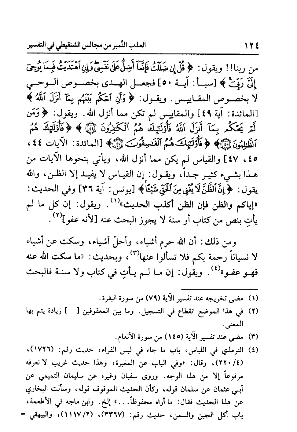 ومن ذلك: أن الله حرم أشياء، وأحَلَّ أشْيَاءَ، وَسَكَتَ عَنْ أشْيَاء لا نسياناً رحمة بكم فلا تسألوا عنها (¬3)، وفي حديث: «مَا سَكَتَ اللهُ عَنْهُ فَهُوَ عَفْوٌ» (¬4). ويقول: إن ما لم يأتِ في كتاب ولا سنة فالبحث