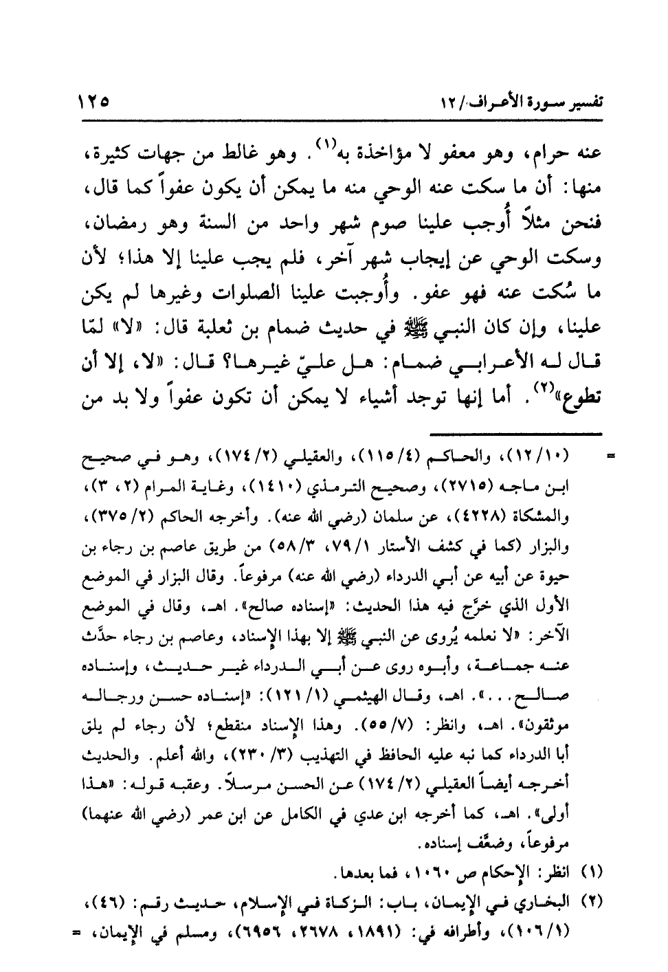 وهو غالط من جهات كثيرة، منها: أن ما سكت عنه الوحي منه ما يمكن أن يكون عفواً كما قال، فنحن مثلاً أُوجِبَ علينا صوم شهر واحد من السنة وهو رمضان، وسكت الوحي عن إيجاب شهر آخر، فلم يجب علينا إلا هذا؛ لأن ما سُكِتَ عنْه فهو عفو، وأُوجبت علينا الصلوات وغيرها لم يكن علينا، وإن كان النبي صلى الله عليه وسلم في حديث ضمام بن ثعلبة قال: «لا» لمّا قال له الأعرابي ضمام: هل عليّ غيرها؟ قال: «لاَ، إِلاّ أَنْ تَطوّعَ» (¬2). أما إنها توجد أشياء لا يمكن أن تكون عَفْواً ولا بد من
