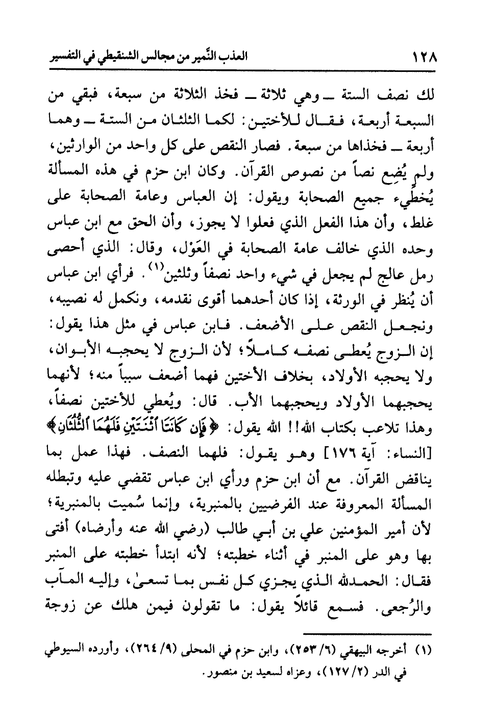 فصار النقص على كل واحد من الوارثين، ولم يُضِع نصّاً من نصوص القرآن. وكان ابن حزم في هذه المسالة يُخطِّيء جميع الصحابة ويقول: إن العباس وعامة الصحابة على غلط، وأن هذا الفعل الذي فعلوا لا يجوز، وأن الحق مع ابن عباس وَحْدَه الذي خالف عامة الصحابة في العَوْل، وقال: الذي أحصى رمل عالج لم يجعل في شيء واحد نصفاً وثلثين (¬1). فرأي ابن عباس أن يُنظر في الورثة، إذا كان أحدهما أقْوَى نُقَدِّمُه، ونكمل له نصيبه، ونجعل النقص على الأضعف، فابن عباس في مثل هذا يقول: إن الزوج يُعطى نصفه كاملاً؛ لأن الزوج لا يحجبه الأبوان، ولا يحجبه الأولاد، بخلاف الأختين فهما أضعف سبباً منه؛ لأنهما يحجبهما الأولاد ويحجبهما الأب. قال: وُيعطي للأختين نصفاً، وهذا تلاعب بكتاب الله!! الله يقول: {فَإِن كَانَتَا اثْنَتَيْنِ فَلَهُمَا الثُّلُثَانِ} [النساء: آية 176] وهو يقول: فلهما النصف. فهذا عمل بما يناقض القرآن. مع أن ابن حزم ورأي ابن عباس تقضي عليه وتبطله المسألة المعروفة عند الفرضيين بالمنبرية، وإنما سُميت بالمنبرية؛ لأن أمير المؤمنين علي بن أبي طالب (رضي الله عنه وأرضاه) أفتى بها وهو على المنبر في أثناء خطبته؛ لأنه ابتدأ خطبته على المنبر فقال: الحمد لله الذي يجزي كل نفس بما تسعى، وإليه المآب والرُّجعى. فسمع قائلاً يقول: ما تقولون فيمن هلك عن زوجة