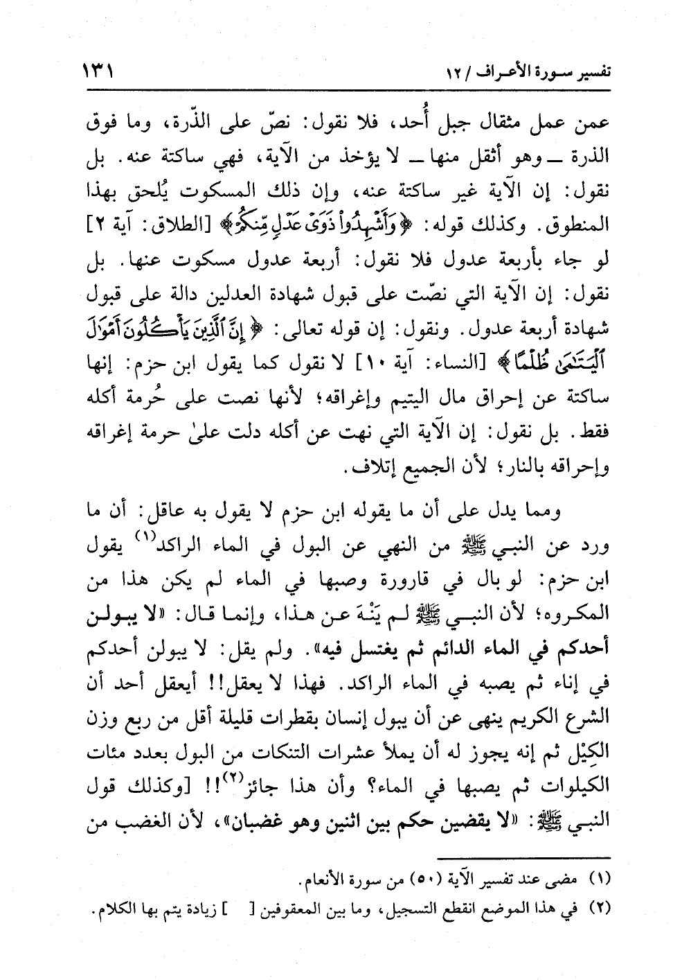 ومما يدل على أن ما يقوله ابن حزم لا يقول به عاقل: أن ما ورد عن النبي صلى الله عليه وسلم من النهي عن البول في الماء الراكد (¬1) يقول ابن حزم: لو بال في قارورة وصبها في الماء لم يكن هذا من المكروه؛ لأن النبي صلى الله عليه وسلم لم يَنْهَ عن هذا، وإنما قال: «لاَ يَبُولَنَّ أَحَدُكُمْ فِي المَاءِ الدَّائِمِ ثُمَّ يَغْتَسِلُ فِيهِ». ولم يقل: لا يبولن أحدكم في إناء ثم يصبه في الماء الراكد. فهذا لا يعقل!! أيعقل أحد أن الشرع الكريم ينهى عن أن يبول إنسان بقطرات قليلة أقل من ربع وزن الكِيْل ثم إنه يجوز له أن يملأ عشرات التنكات من البول بعدد مئات الكيلوات ثم يصبها في الماء؟ وأن هذا جائز (¬2)!! [وكذلك قول النبي صلى الله عليه وسلم: «لاَ يَقْضِينَّ حَكَمٌ بَيْنَ اثْنَيْنِ وَهُوَ غَضْبَان»، لأن الغضب من