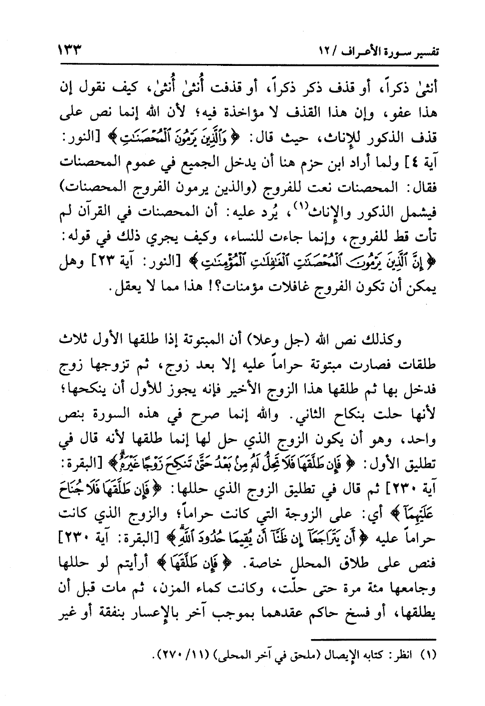 أنثى ذكراً، أو قذف ذكر ذكراً، أو قذفت أُنثى أُنثى، كيف نقول إن هذا عفو، وإن هذا القذف لا مؤاخذة فيه؛ لأن الله إنما نص على قذف الذكور للإناث، حيث قال: {وَالَّذِينَ يَرْمُونَ الْمُحْصَنَاتِ} [النور: آية 4] ولما أراد ابن حزم هنا أن يدخل الجميع في عموم المحصنات فقال: المحصنات نعت للفروج (والذين يرمون الفروج المحصنات) فيشمل الذكور والإناث (¬1)، يُرد عليه: أن المحصنات في القرآن لم تأتِ قط للفروج، وإنما جاءت للنساء، وكيف يجري ذلك في قوله: {إِنَّ الَّذِينَ يَرْمُونَ الْمُحْصَنَاتِ الْغَافِلاَتِ الْمُؤْمِنَاتِ} [النور: آية 23] وهل يمكن أن تكون الفروج غافلات مؤمنات؟! هذا مما لا يعقل.