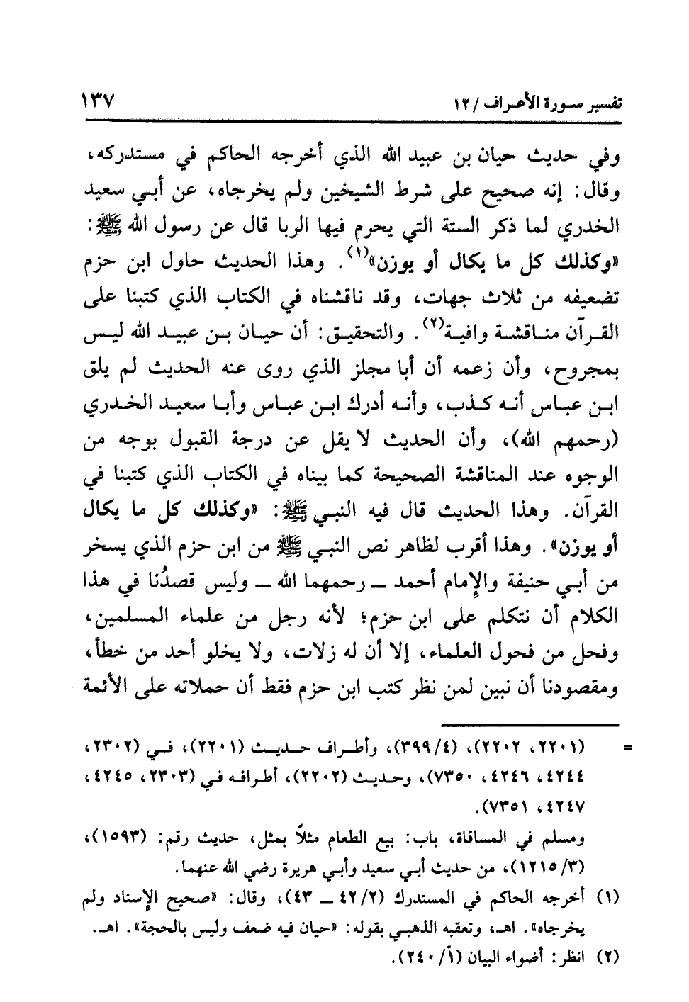 وفي حديث حيان بن عبيد الله الذي أخرجه الحاكم في مستدركه، وقال: إنه صحيح على شرط الشيخين ولم يخرجاه، عن أبي سعيد الخدري لما ذكر الستة التي يحرم فيها الربا قال عن رسول الله صلى الله عليه وسلم: «وَكَذلِك كُلّ ما يُكَال أو يُوزَن» (¬1). وهذا الحديث حاول ابن حزم تضعيفه من ثلاث جهات، وقد ناقشناه في الكتاب الذي كتبنا على القرآن مناقشة وافية (¬2). والتحقيق: أن حيان بن عبيد الله ليس بمجروح، وأن زعمه أن أبا مجلز الذي روى عنه الحديث لم يلق ابن عباس أنه كذب، وأنه أدرك ابن عباس وأبا سعيد الخدري (رحمهم الله)، وأن الحديث لا يقل عن درجة القبول بوجه من الوجوه عند المناقشة الصحيحة كما بَيَّنَّاهُ في الكتاب الذي كَتَبْنَا في القرآن، وهذا الحديث قال فيه النبي صلى الله عليه وسلم: «وكذلك كل ما يُكَالُ أو يُوزَن». وهذا أقرب لظاهر نص النبي صلى الله عليه وسلم من ابن حزم الذي يسخر من أبي حنيفة والإمام أحمد -رحمهما الله- وليس قصدُنا في هذا الكلام أن نتكلم على ابن حزم؛ لأنه رجل من علماء المسلمين، وفحل من فحول العلماء، إلا أن له زلات، ولا يخلو أحد من خطأ، ومقصودنا أن نبين لمن نظر كتب ابن حزم فقط أن حملاته على الأئمة