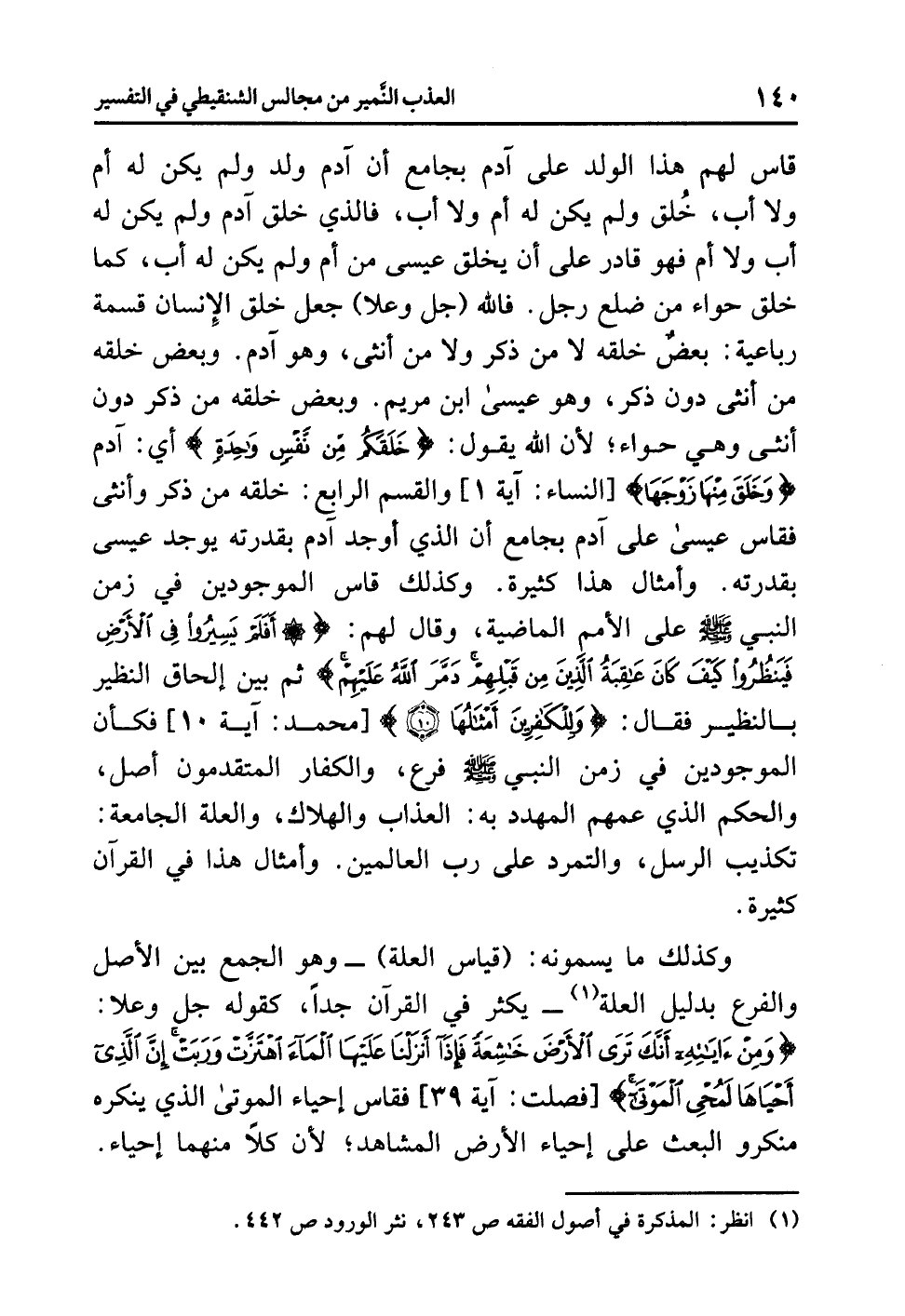 وكذلك ما يسمونه: (قياس العلة) - وهو الجمع بين الأصل والفرع بدليل العلة (¬1) - يكثر في القرآن جدّاً، كقوله جل وعلا: {وَمِنْ آيَاتِهِ أَنَّكَ تَرَى الْأَرْضَ خَاشِعَةً فَإِذَا أَنزَلْنَا عَلَيْهَا الْمَاء اهْتَزَّتْ وَرَبَتْ إِنَّ الَّذِي أَحْيَاهَا لَمُحْيِي الْمَوْتَى} [فصلت: آية 39] فقاس إحياء الموتى الذي ينكره منكرو البعث على إحياء الأرض المشاهد؛ لأن كلاًّ منهما إحياء.