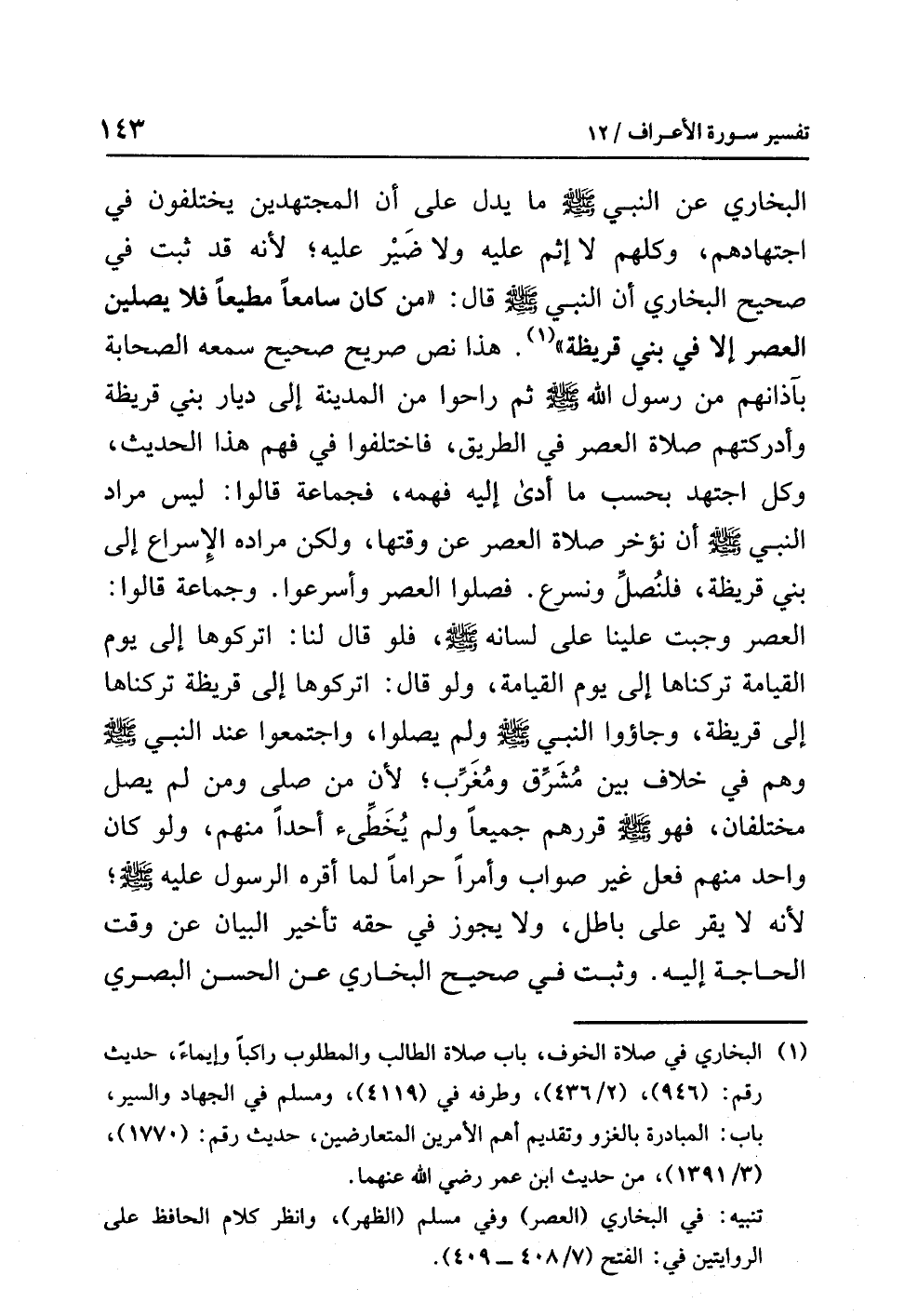 هذا نص صريح صحيح سمعه الصحابة بآذانهم من رسول الله صلى الله عليه وسلم، ثم راحوا من المدينة إلى ديار بني قريظة وأدركتهم صلاة العصر في الطريق، فاختلفوا في فهم هذا الحديث، وكُلٌّ اجْتَهَدَ بحسب ما أدى إليه فهمه، فجماعة قالوا: ليس مراد النبي صلى الله عليه وسلم أن نؤخر صلاة العصر عن وقتها، ولكن مراده الإسراع إلى بني قريظة، فلنصلِّ ونسرع، فصلوا العصر وأسرعوا، وجماعة قالوا: العصر وجبت علينا على لسانه صلى الله عليه وسلم، فلو قال لنا: اتركوها إلى يوم القيامة تركناها إلى يوم القيامة، ولو قال: اتركوها إلى قريظة تركناها إلى قريظة، وجاءوا النبي صلى الله عليه وسلم ولم يصلوا، واجتمعوا عند النبي صلى الله عليه وسلم وهم في خلاف بين مُشَرِّق ومُغَرِّب؛ لأن من صلى ومن لم يصل مختلفان، فهو صلى الله عليه وسلم قررهم جميعاً ولم يُخَطِّئ أحداً منهم، ولو كان واحد منهم فعل غير صواب وأمراً حراماً لما أقره الرسول عليه صلى الله عليه وسلم؛ لأنه لا يقر على باطل، ولا يجوز في حقه تأخير البيان عن وقت الحاجة إليه. وثبت في صحيح البخاري عن الحسن البصري