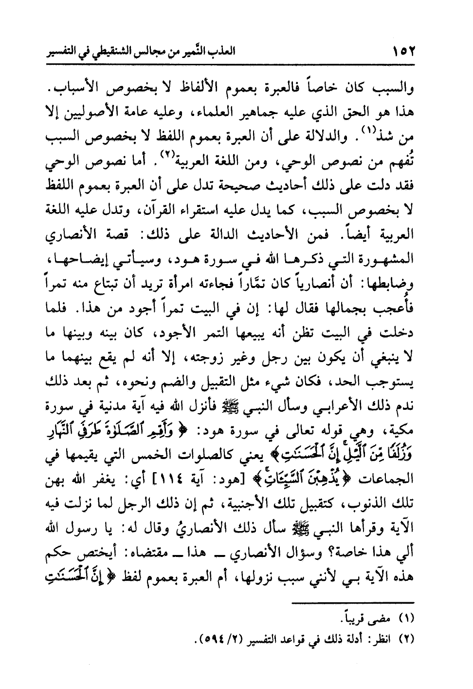 والدلالة على أن العبرة بعموم اللفظ لا بخصوص السبب تفهم من نصوص الوحي، ومن اللغة العربية (¬2). أما نصوص الوحي فقد دلت على ذلك أحاديث صحيحة تدل على أن العِبْرة بعموم اللفظ لا بخصوص السبب، كما يدل عليه استقراء القرآن، وتدل عليه اللغة العربية أيضاً. فمن الأحاديث الدالة على ذلك: قصة الأنصاري المشهورة التي ذكرها الله في سورة هود، وسيأتي إيضاحها، وضابطها: أن أنصاريّاً كان تمَّاراً فجاءته امرأة تريد أن تبتاع منه تمراً فأُعجب بجمالها فقال لها: إن في البيت تمراً أجود من هذا، فلما دخلت في البيت تظن أنه يبيعها التمر الأجود كان بينه وبينها ما لا ينبغي أن يكون بين رجل وغير زوجته، إلا أنه لم يقع بينهما ما يستوجب الحد، فكان شيء مثل التقبيل والضم ونحوه، ثم بعد ذلك ندم ذلك الأعرابي وسأل النبي صلى الله عليه وسلم، فَأَنْزَلَ اللهُ فيه آية مدنية في سورة مكية، وهي قوله تعالى في سورة هود: {وَأَقِمِ الصَّلاةَ طَرَفَيِ النَّهَارِ وَزُلَفاً مِّنَ اللَّيْلِ إِنَّ الْحَسَنَاتِ} يعني كالصلوات الخمس التي يقيمها في الجماعات {يُذْهِبْنَ السَّيِّئَاتِ} [هود: آية 114] أي: يغفر الله بهن تلك الذنوب، كتقبيل تلك الأجنبية، ثم إن ذلك الرجل لما نزلت فيه الآية وقرأها النبي صلى الله عليه وسلم سأل ذلك الأنصاريُّ وقال له: يا رسول الله ألي هذا خاصة؟ وسؤال الأنصاري - هذا - مقتضاه: أيختص حكم هذه الآية بي لأنني سبب نزولها، أم العبرة بعموم لفظ {إِنَّ الْحَسَنَاتِ