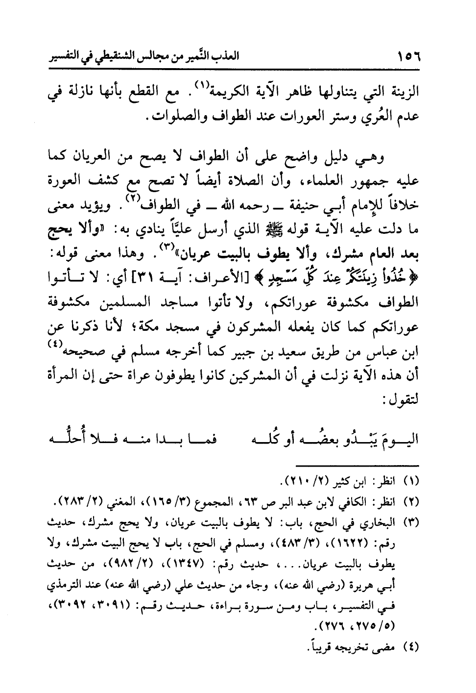 وهي دليل واضح على أن الطواف لا يَصِحّ مِنَ العُرْيَان كما عليه جمهور العلماء، وأن الصلاة أيضاً لا تَصِحُّ مَعَ كشْفِ العَوْرَةِ خلافاً للإمام أبي حنيفة - رحمه الله - في الطواف (¬2). ويؤيد معنى ما دلت عليه الآية قوله صلى الله عليه وسلم الذي أرسل عليًّا ينادي به: «وَأَلاّ يحج بَعْدَ العَامِ مُشْرِكٌ، وألا يطُوفَ بالبيْتِ عُرْيَانٌ» (¬3). وهذا معنى قوله: {خُذُواْ زِينَتَكُمْ عِندَ كُلِّ مَسْجِدٍ} [الأعراف: آية 31] أي: لا تأتوا الطواف مكشوفة عوراتكم، ولا تأتوا مساجد المسلمين مكشوفة عوراتكم كما كان يفعله المشركون في مسجد مكة؛ لأنا ذكرنا عن ابن عباسٍ من طريق سعيد بن جبير كما أخرجه مسلم في صحيحه (¬4) أن هذه الآية نزلت في أن المشركين كانوا يطوفون عراة، حتى إن المرأة لتقول: