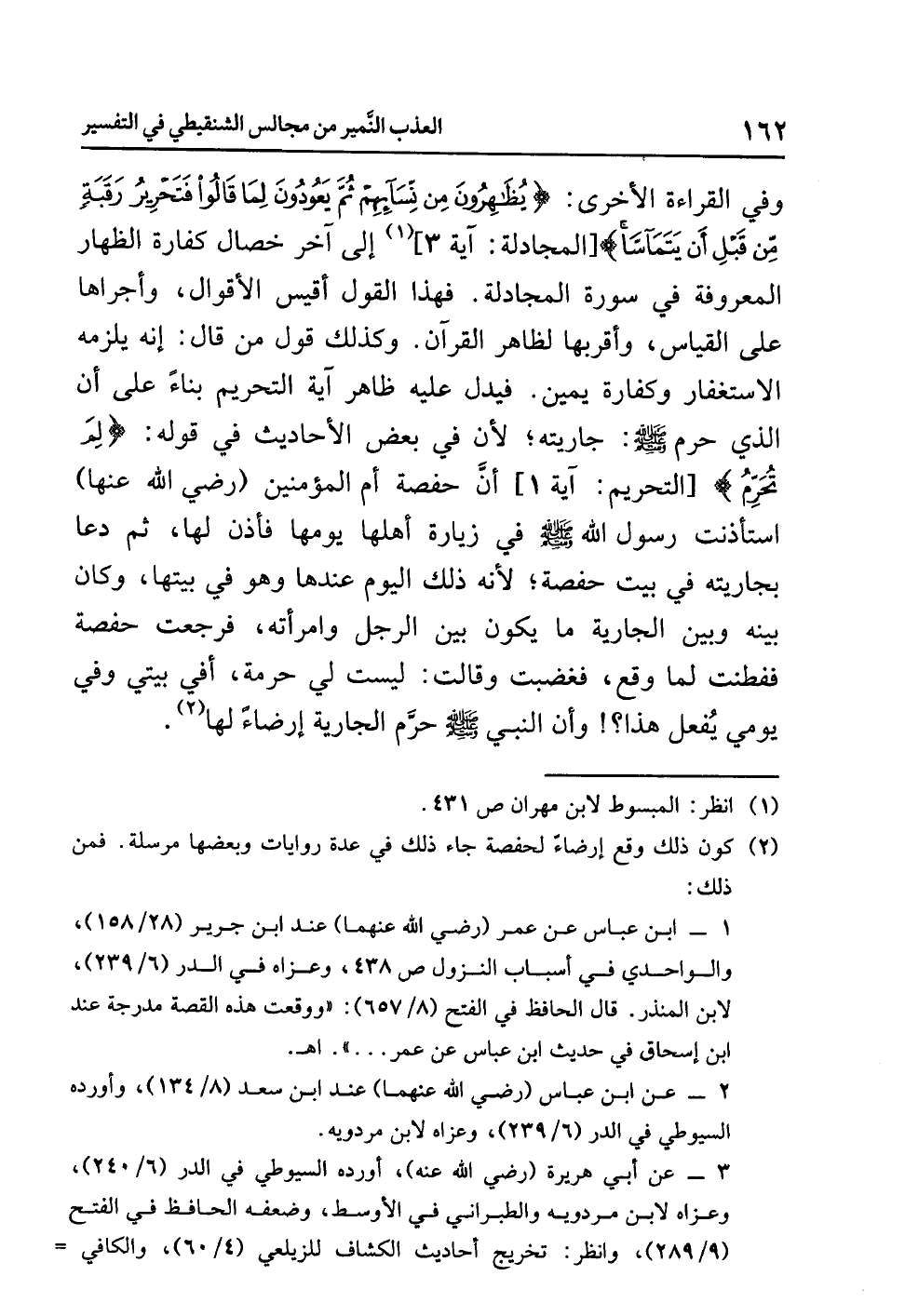 وكذلك قول مَنْ قَالَ: إنه يلزمه الاسْتِغْفَار وكفارة يمين، فيدل عليه ظاهر آية التحريم بناءً على أن الذي حرم صلى الله عليه وسلم: جاريته؛ لأن في بعض الأحاديث في قوله: {لِمَ تُحَرِّمُ} [التحريم: آية 1] أنَّ حفصة أم المؤمنين (رضي الله عنها) استأذنت رسول الله صلى الله عليه وسلم في زيارة أهلها يومها فأذن لها، ثم دعا بجاريته في بيت حفصة؛ لأنه ذلك اليوم عندها وهو في بيتها، وكان بينه وبين الجارية ما يكون بين الرجل وامرأته، فرجعت حفصة ففطنت لما وقع، فغضبت وقالت: ليست لي حرمة، أفي بيتي وفي يومي يُفعل هذا؟! وأن النبي صلى الله عليه وسلم حرَّم الجارية إرضاءً لها (¬2).