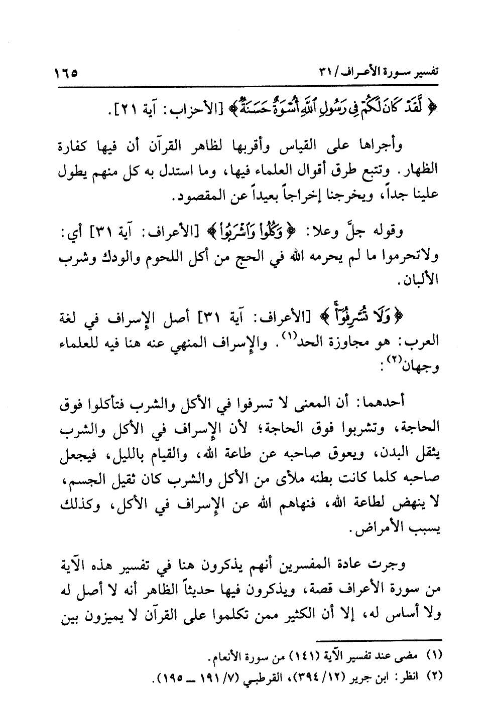 {وَلا تُسْرِفُواْ} [الأعراف: آية 31] أصل الإسراف في لغة العرب: هو مجاوزة الحد (¬1). والإسراف المنهي عنه هنا فيه للعلماء وجهان (¬2):