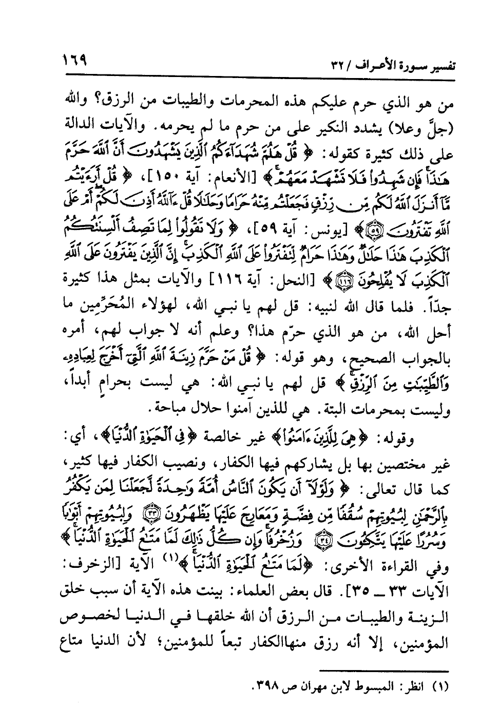 من هو الذي حرم عليكم هذه المحرمات والطيبات من الرزق؟ والله (جلَّ وعلا) يشدد النكير على من حرم ما لم يحرمه. والآيات الدالة على ذلك كثيرة كقوله: {قُلْ هَلُمَّ شُهَدَاءكُمُ الَّذِينَ يَشْهَدُونَ أَنَّ الله حَرَّمَ هَذَا فَإِن شَهِدُواْ فَلاَ تَشْهَدْ مَعَهُمْ} [الأنعام: آية 150] {قُلْ أَرَأَيْتُم مَّا أَنزَلَ اللهُ لَكُم مِّن رِّزْقٍ فَجَعَلْتُم مِّنْهُ حَرَاماً وَحَلاَلاً قُلْ آللهُ أَذِنَ لَكُمْ أَمْ عَلَى اللهِ تَفْتَرُونَ (59)} [يونس: آية 59] {وَلاَ تَقُولُواْ لِمَا تَصِفُ أَلْسِنَتُكُمُ الْكَذِبَ هَذَا حَلاَلٌ وَهَذَا حَرَامٌ لِّتَفْتَرُواْ عَلَى اللهِ الْكَذِبَ إِنَّ الَّذِينَ يَفْتَرُونَ عَلَى اللهِ الْكَذِبَ لاَ يُفْلِحُونَ (116)} [النحل: آية 116] والآيات بمثل هذا كثيرة جدّاً. فلما قال الله لنبيه: قل لهم يا نبي الله، لهؤلاء المُحَرِّمِين ما أحل الله، من هو الذي حَرَّمَ هذا؟ وعلم أنه لا جواب لهم، أمره بالجواب الصحيح، وهو قوله: {قُلْ مَنْ حَرَّمَ زِينَةَ الله الَّتِيَ أَخْرَجَ لِعِبَادِهِ وَالْطَّيِّبَاتِ مِنَ الرِّزْقِ} قل لهم يا نبي الله: هي ليست بحرامٍ أبداً، وليست بمحرمات ألبتة. هي للذين آمنوا حلال مباحة.