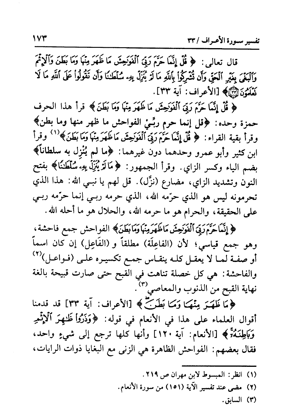 {قُلْ إِنَّمَا حَرَّمَ رَبِّيَ الْفَوَاحِشَ مَا ظَهَرَ مِنْهَا وَمَا بَطَنَ} قرأ هذا الحرف حمزة وحده: {قُلْ إِنَّمَا حَرَّمَ رَبِّي الْفَواحِشَ مَا ظَهَرَ مِنْهَا وَمَا بَطَنَ} وقرأ بقية القراء: {قُلْ إِنَّمَا حَرَّمَ رَبِّيَ الْفَوَاحِشَ مَا ظَهَرَ مِنْهَا وَمَا بَطَنَ} (¬1) وقرأ ابن كثير وأبو عمرو وحدهما دون غيرهما: {ما لم يُنْزِلْ به سلطاناً} بضم الياء وكسر الزاي. وقرأ الجمهور: {مَا لَمْ يُنَزِّلْ بِهِ سُلْطَاناً} بفتح النون وتشديد الزاي، مضارع (نزَّل).