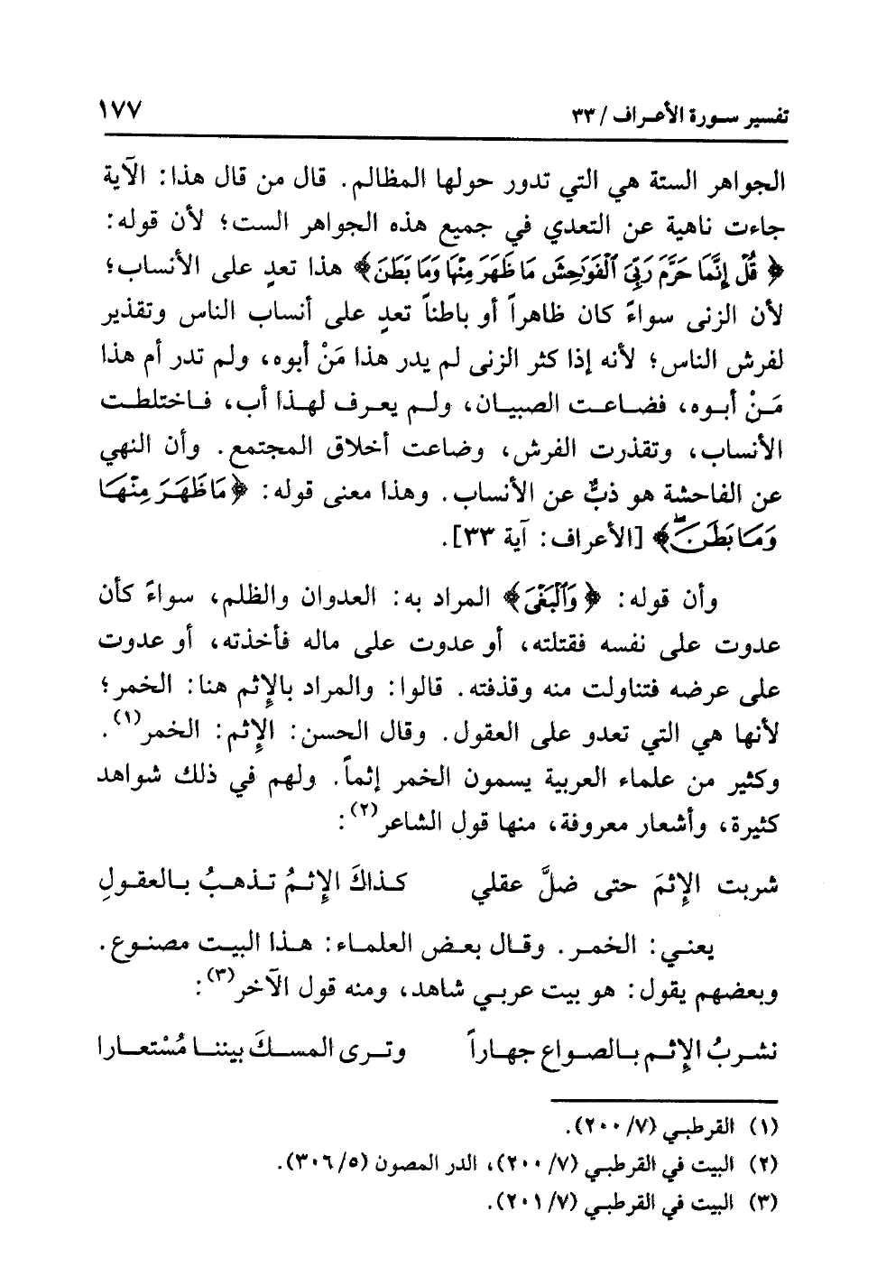 وأن قوله: {وَالْبَغْيَ} المراد به: العدوان والظلم، سواءً كأن عدوت على نفسه فقتلته، أو عدوت على ماله فأخذته، أو عدوت على عرضه فتناولت منه وقذفته. قالوا: والمراد بالإثم هنا: الخمر؛ لأنها هي التي تعدو على العقول. وقال الحسن: الإثم: الخمر (¬1). وكثير من علماء العربية يسمون الخمر إثماً. ولهم في ذلك شواهد كثيرة، وأشعار معروفة، منها قول الشاعر (¬2):