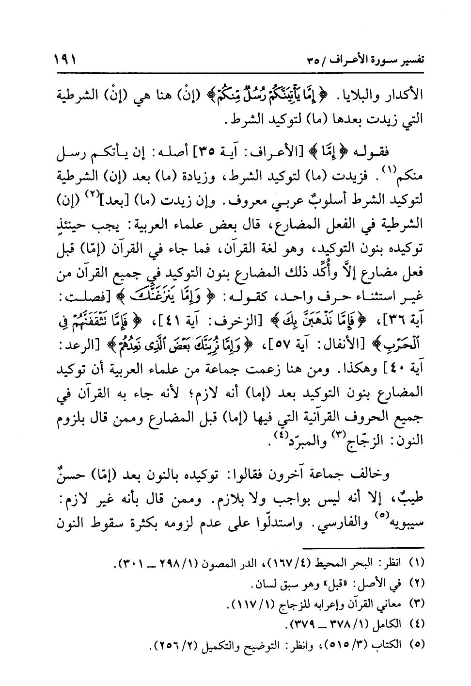 فقوله {إمَّا} [الأعراف: آية 35] أصله: إن يأتكم رسل منكم (¬1). فزيدت (ما) لتوكيد الشرط، وزيادة (ما) بعد (إن) الشرطية لتوكيد الشرط أسلوبٌ عربي معروف. وإن زيدت (ما) [بعد] (¬2) (إن) الشرطية في الفعل المضارع، قال بعض علماء العربية: يجب حينئذٍ توكيده بنون التوكيد، وهو لغة القرآن، فما جاء في القرآن (إمّا) قبل فعل مضارع إلاَّ وأُكِّد ذلك المضارع بنون التوكيد في جميع القرآن من غير استثناء حرف واحد، كقوله: {وَإمَّا يَنزَغَنَّكَ} [فصلت: آية 36] {فَإمَّا نَذهَبَنَّ بِكَ} [الزخرف: آية 41] {فإمَّا تثْقَفَنَّهُمْ فِى الحَرب} [الأنفال: آية 57] {وإمَّا نُرِيَنَّكَ بَعْضَ الَّذِي نَعِدُهُمْ} [الرعد: آية 40] وهكذا. ومن هنا زعمت جماعة من علماء العربية أن توكيد المضارع بنون التوكيد بعد (إما) أنه لازم؛ لأنه جاء به القرآن في جميع الحروف القرآنية التي فيها (إما) قبل المضارع وممن قال بلزوم النون: الزجّاج (¬3) والمبرّد (¬4).