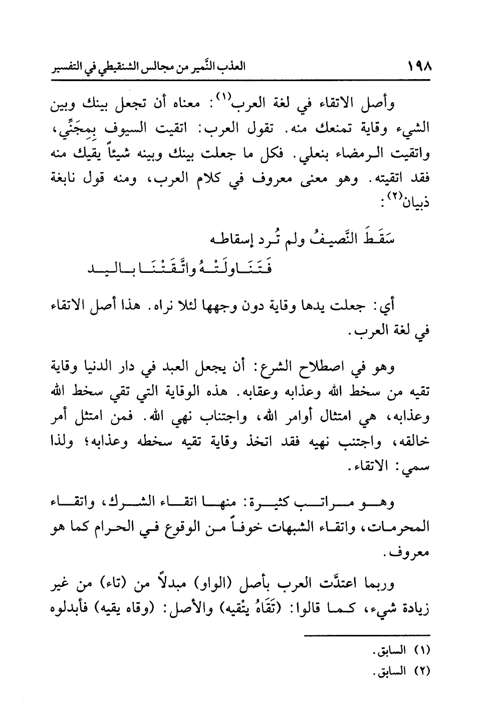 وأصل الاتقاء في لغة العرب (¬1): معناه أن تجعل بينك وبين الشيء وقاية تمنعك منه. تقول العرب: اتقيت السيوف بِمِجَنِّي، واتقيت الرمضاء بنعلي. فكل ما جعلت بينك وبينه شيئاً يقيك منه فقد اتقيته. وهو معنى معروف في كلام العرب، ومنه قول نابغة ذبيان (¬2):