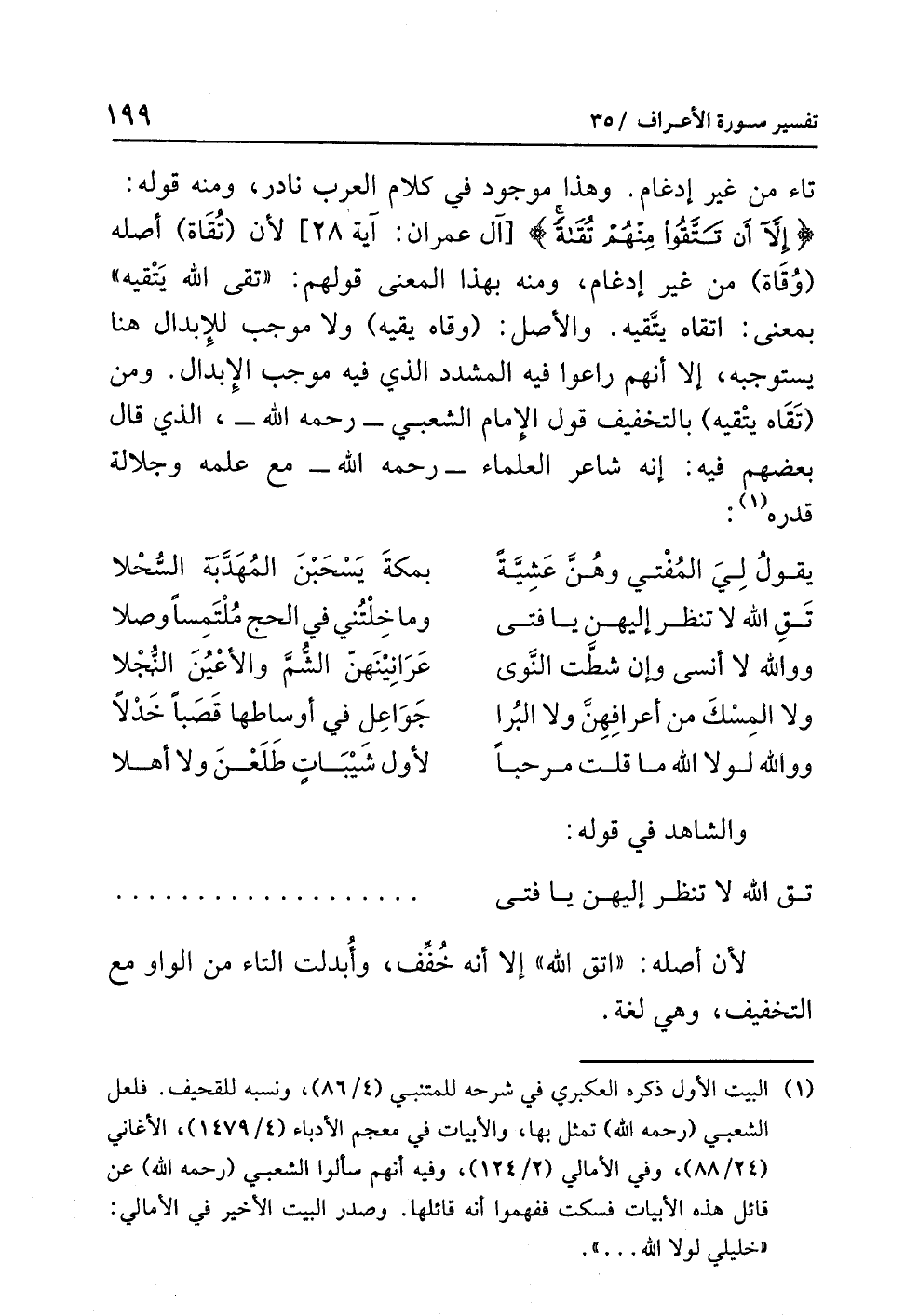 تاء من غير إدغام. وهذا موجود في كلام العرب نادر، ومنه قوله: {إِلاَّ أَن تَتَّقُواْ مِنْهُمْ تُقَاةً} [آل عمران: آية 28] لأن (تُقَاة) أصله (وُقَاة) من غير إدغام، ومنه بهذا المعنى قولهم: «تقى الله يَتْقيه» بمعنى: اتقاه يتَّقيه. والأصل: (وقاه يقيه) ولا موجب للإبدال هنا يستوجبه، إلا أنهم راعوا فيه المشدد الذي فيه موجب الإبدال. ومن (تَقَاه يتْقيه) بالتخفيف قول الإمام الشعبي -رحمه الله- الذي قال بعضهم فيه: إنه شاعر العلماء -رحمه الله- مع علمه وجلالة قدره (¬1):