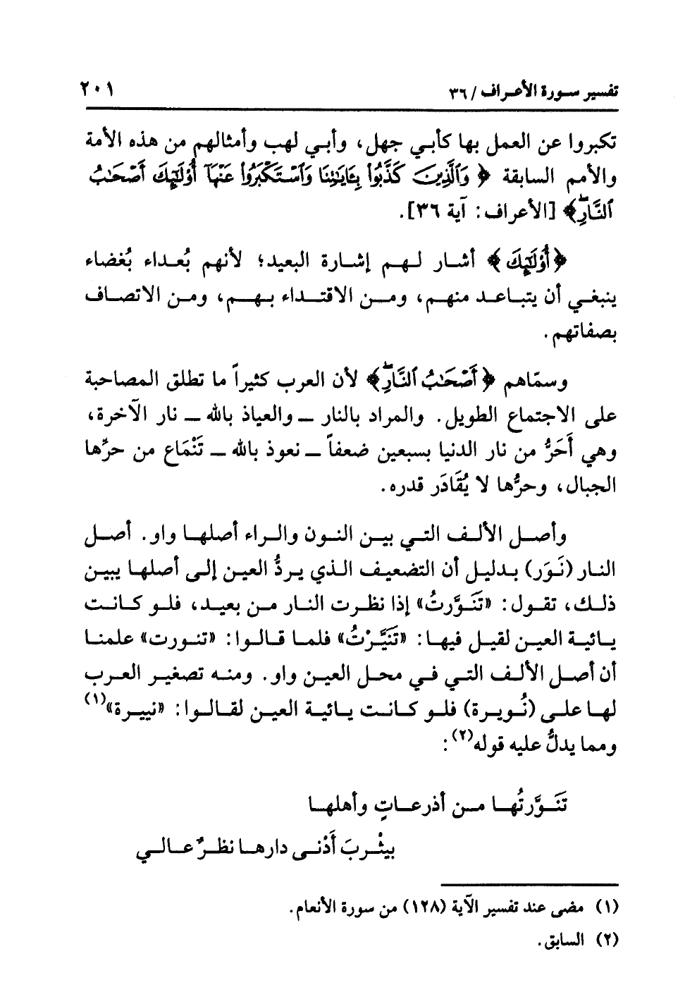 وأصل الألف التي بين النون والراء أصلها واو. أصل النار (نَوَر) بدليل أن التضعيف الذي يردُّ العين إلى أصلها يبين ذلك، تقول: (تنَوَّرتُ) إذا نظرت النار من بعيد، فلو كانت يائية العين لقيل فيها: (تَنَيَّرْتُ) فلما قالوا: (تنورت) علمنا أن أصل الألف التي في محل العين واو، ومنه تصغير العرب لها على (نُويرة) فلو كانت يائية العين لقالوا: «نُييرة» (¬1) ومما يدلُّ عليه قوله (¬2):
