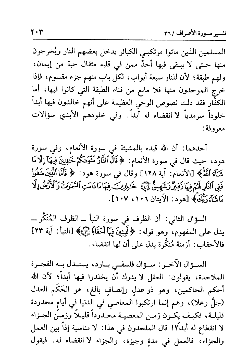 أحدهما أن الله قيده بالمشيئة في سورة الأنعام، وفي سورة هود، حيث قال في سورة الأنعام: {قَالَ النَّارُ مَثْوَاكُمْ خَالِدِينَ فِيهَا إِلاَّ مَا شَاءَ اللهُ} [الأنعام: آية 128] وقال في سورة هود: {فَأَمَّا الَّذِينَ شَقُواْ فَفِي النَّارِ لَهُمْ فِيهَا زَفِيرٌ وَشَهِيقٌ (106) خَالِدِينَ فِيهَا مَا دَامَتِ السَّمَاوَاتُ وَالأَرْضُ إِلاَّ مَا شَاء رَبُّكَ} [هود: الآيتان 106، 107].