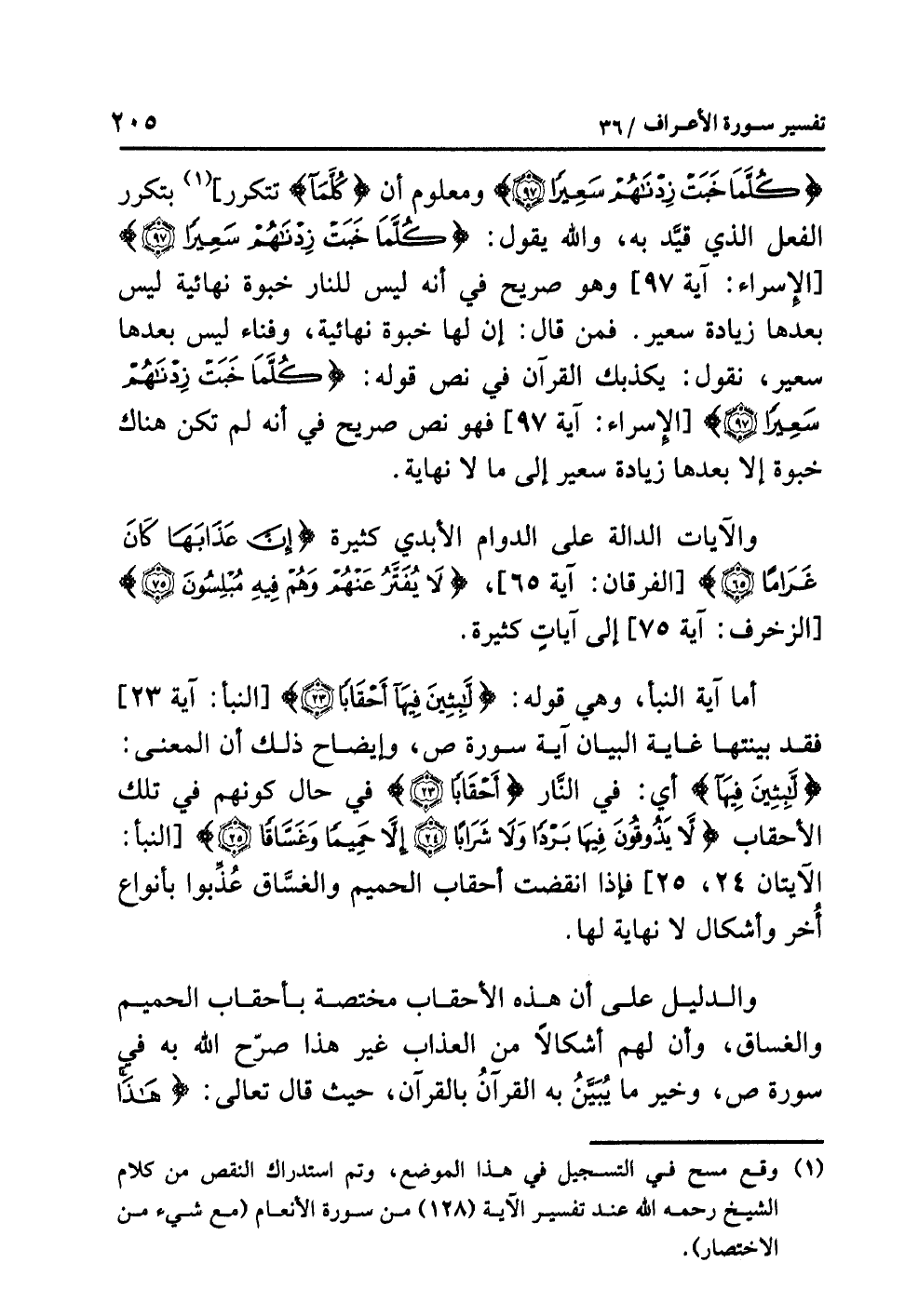 {كُلَّمَا خَبَتْ زِدْنَاهُمْ سَعِيراً} ومعلوم أن {كُلَّمَا} تتكرر] (¬1) بتكرر الفعل الذي قيّد به، والله يقول: {كُلَّمَا خَبَتْ زِدْنَاهُمْ سَعِيراً} [الإسراء: آية 97] وهو صريح في أنه ليس للنار خبوة نهائية ليس بعدها زيادة سعير، فمن قال: إن لها خبوة نهائية، وفناء ليس بعدها سعير، نقول: يكذبك القرآن في نص قوله: {كُلَّمَا خَبَتْ زِدْنَاهُمْ سَعِيراً} [الإسراء: آية 97] فهو نص صريح في أنه لم تكن هناك خبوة إلا بعدها زيادة سعير إلى ما لا نهاية.