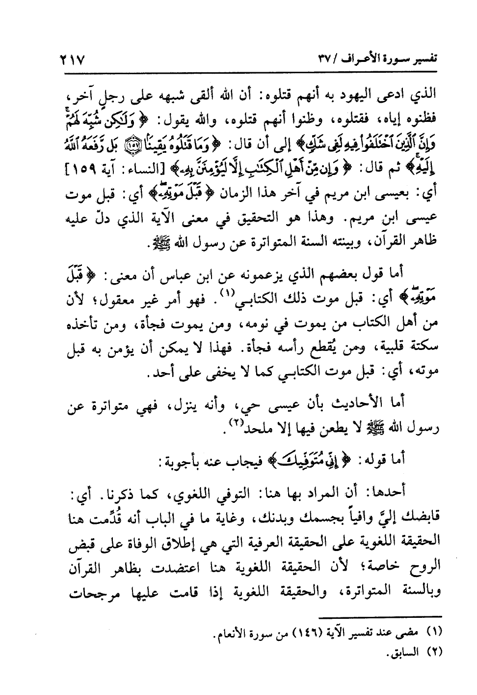 أحدها: أن المراد بها هنا: التوفي اللغوي، كما ذكرنا. أي: قابضك إليَّ وافياً بجسمك وبدنك، وغاية ما في الباب أنه قُدِّمت هنا الحقيقة اللغوية على الحقيقة العرفية التي هي إطلاق الوفاة على قبض الروح خاصة؛ لأن الحقيقة اللغوية هنا اعتضدت بظاهر القرآن وبالسنة المتواترة، والحقيقة اللغوية إذا قامت عليها مرجحات
