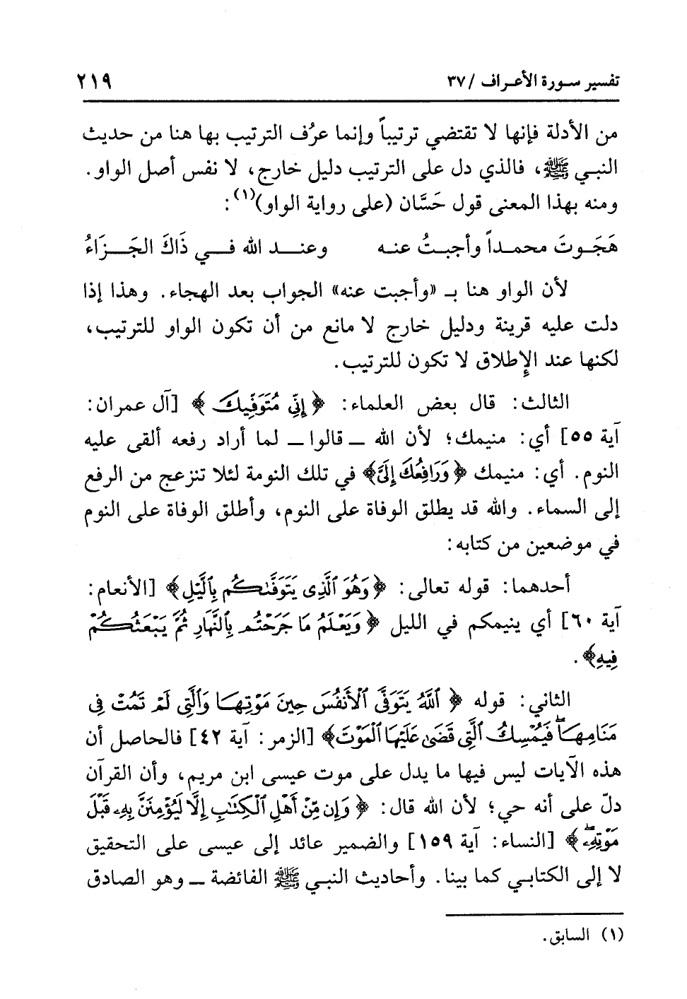 الثاني: قوله {الله يَتَوَفَّى الْأَنفُسَ حِينَ مَوْتِهَا وَالَّتِي لَمْ تَمُتْ فِي مَنَامِهَا فَيُمْسِكُ الَّتِي قَضَى عَلَيْهَا الْمَوْتَ} [الزمر: آية 42] فالحاصل أن هذه الآيات ليس فيها ما يدل على موت عيسى ابن مريم، وأن القرآن دلّ على أنه حي؛ لأن الله قال: {وَإِن مِّنْ أَهْلِ الْكِتَابِ إِلاَّ لَيُؤْمِنَنَّ بِهِ قَبْلَ مَوْتِهِ} [النساء: آية 159] والضمير عائد إلى عيسى على التحقيق لا إلى الكتابي كما بينا. وأحاديث النبي صلى الله عليه وسلم الفائضة - وهو الصادق