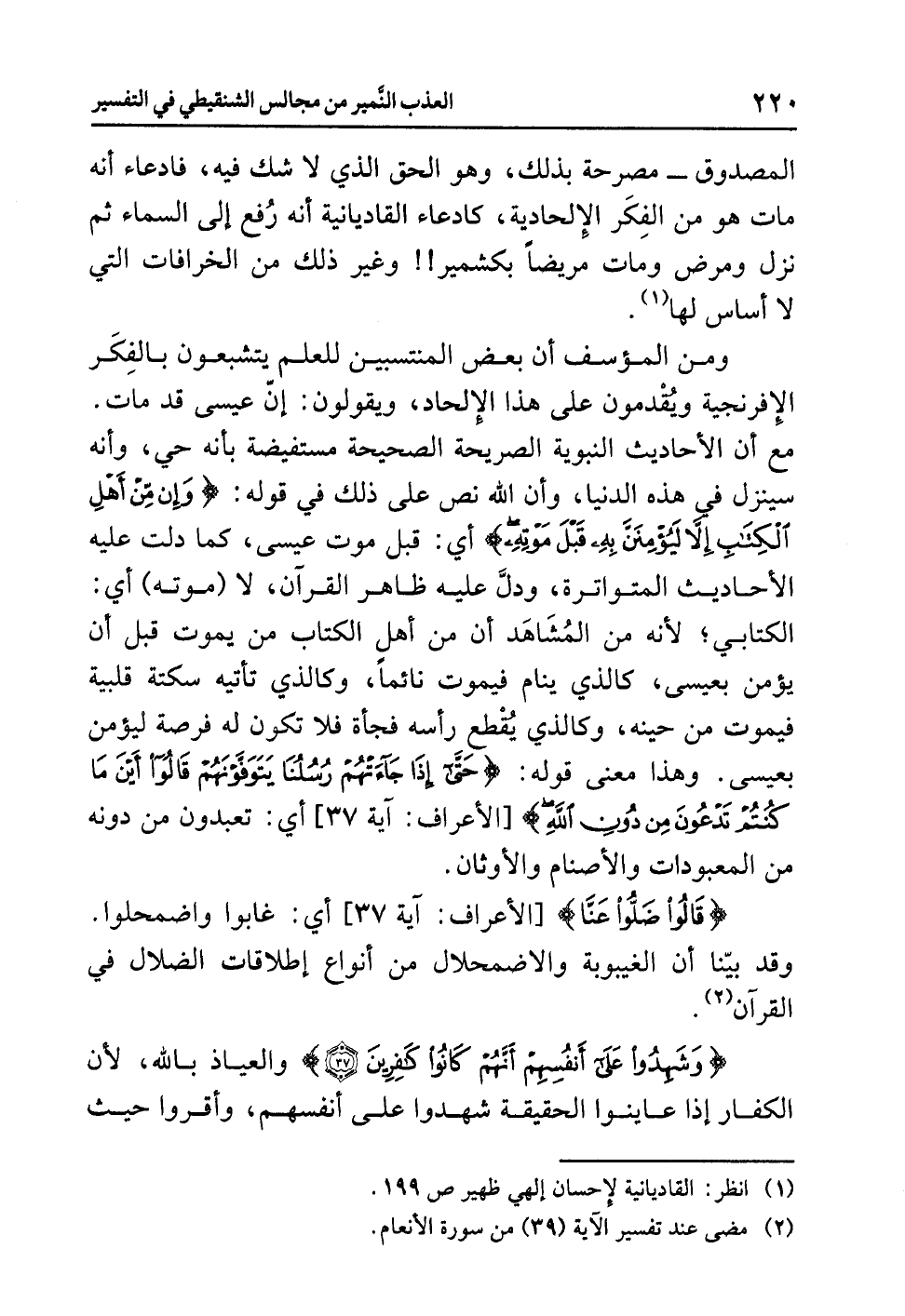 ومن المؤسف أن بعض المنتسبين للعلم يَتَشَبَّعُون بالفِكَر الإفرنجية ويُقْدمون على هذا الإلحاد، ويقولون: إنَّ عيسى قد مات. مع أن الأحاديث النبوية الصريحة الصحيحة مستفيضة بأنه حي، وأنه سينزل في هذه الدنيا، وأن الله نص على ذلك في قوله: {وَإِن مِّنْ أَهْلِ الْكِتَابِ إِلاَّ لَيُؤْمِنَنَّ بِهِ قَبْلَ مَوْتِهِ} أي: قبل موت عيسى، كما دلت عليه الأحاديث المتواترة، ودلَّ عليه ظاهر القرآن، لا (موته) أي: الكتابي؛ لأنه من المُشَاهَد أن من أهل الكتاب من يموت قبل أن يؤمن بعيسى، كالذي ينام فيموت نائماً، وكالذي تأتيه سكتة قلبية فيموت من حينه، وكالذي يُقْطع رأسه فجأة ولا تكون له فرصة ليؤمن بعيسى. وهذا معنى قوله: {حَتَّى إِذَا جَاءتْهُمْ رُسُلُنَا يَتَوَفَّوْنَهُمْ قَالُواْ أَيْنَ مَا كُنتُمْ تَدْعُونَ مِن دُونِ الله} [الأعراف: آية 37] أي: تعبدون من دونه من المعبودات والأصنام والأوثان.