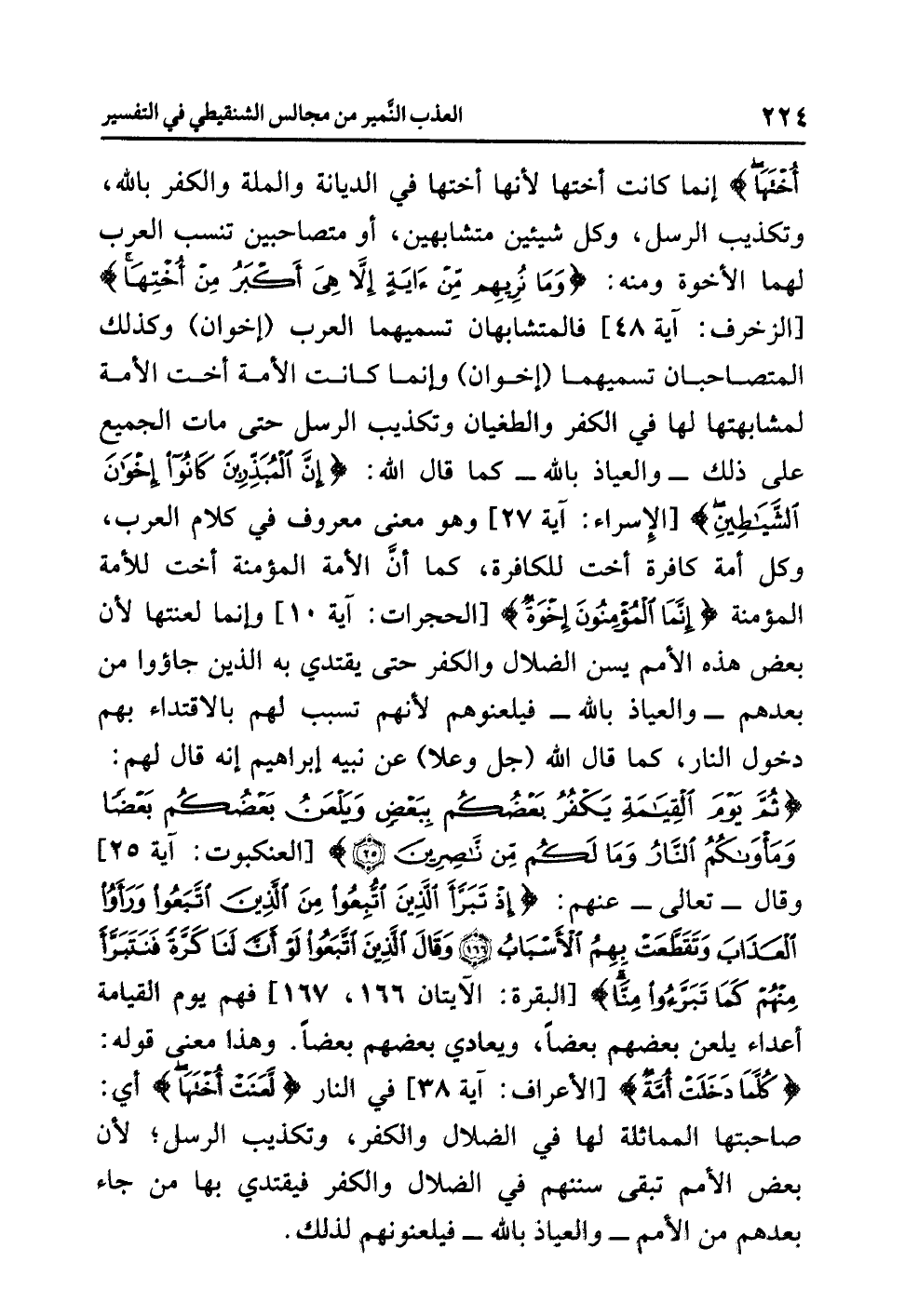 أُخْتَهَا} إنما كانت أختها لأنها أختها في الديانة والملة والكفر بالله، وتكذيب الرسل، وكل شيئين متشابهين، أو متصاحبين تنسب العرب لهما الأخوة ومنه: {وَمَا نُرِيهِم مِّنْ آيَةٍ إِلاَّ هِيَ أَكْبَرُ مِنْ أُخْتِهَا} [الزخرف: آية 48] فالمتشابهان تسميهما العرب (إخوان) وكذلك المتصاحبان تسميهما (إخوان) وإنما كانت الأمة أخت الأمة لمشابهتها لها في الكفر والطغيان وتكذيب الرسل حتى مات الجميع على ذلك ... - والعياذ بالله - كما قال الله: {إِنَّ الْمُبَذِّرِينَ كَانُواْ إِخْوَانَ الشَّيَاطِينِ} [الإسراء: آية 27] وهو معنى معروف في كلام العرب، وكل أمة كافرة أخت للكافرة، كما أنَّ الأمة المؤمنة أخت للأمة المؤمنة {إِنَّمَا الْمُؤْمِنُونَ إِخْوَةٌ} [الحجرات: آية 10] وإنما لعنتها لأن بعض هذه الأمم يسن الضلال والكفر حتى يقتدي به الذين جاءوا من بعدهم -والعياذ بالله- فيلعنوهم لأنهم تَسَبَّبَ لهم بِالاقْتِدَاءِ بهم دخولُ النار، كما قال الله (جل وعلا) عن نبيه إبراهيم إنه قال لهم: {ثُمَّ يَوْمَ الْقِيَامَةِ يَكْفُرُ بَعْضُكُم بِبَعْضٍ وَيَلْعَنُ بَعْضُكُم بَعْضاً وَمَأْوَاكُمُ النَّارُ وَمَا لَكُم مِّن نَّاصِرِينَ} [العنكبوت: آية 25] وقال تعالى عنهم: {إِذْ تَبَرَّأَ الَّذِينَ اتُّبِعُواْ مِنَ الَّذِينَ اتَّبَعُواْ وَرَأَوُاْ الْعَذَابَ وَتَقَطَّعَتْ بِهِمُ الأَسْبَابُ (166) وَقَالَ الَّذِينَ اتَّبَعُواْ لَوْ أَنَّ لَنَا كَرَّةً فَنَتَبَرَّأَ مِنْهُمْ كَمَا تَبَرَّؤُواْ مِنَّا} [البقرة: الآيتان 166، 167] فهم يوم القيامة أعداء يلعن بعضهم بعضاً، ويعادي بعضهم بعضاً، وهذا معنى قوله: {كُلّمَا دَخَلَتْ أُمّةٌ} [الأعراف: آية 38] في النار {لَعَنَت أُخْتَهَا} أي: صاحبتها المماثلة لها في الضلال والكفر، وتكذيب الرسل؛ لأن بعض الأمم تبقى سننهم في الضلال والكفر فيقتدي بها من جاء بعدهم من الأمم -والعياذ بالله- فيلعنونهم لذلك.