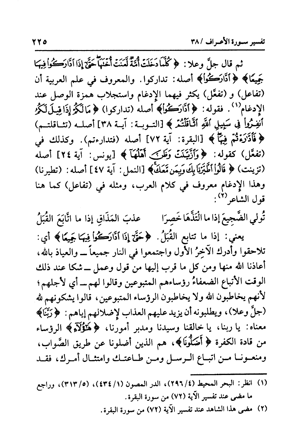 ثم قال جلَّ وعلا: {كُلَّمَا دَخَلَتْ أُمَّةٌ لَّعَنَتْ أُخْتَهَا حَتَّى إِذَا ادَّارَكُواْ فِيهَا جَمِيعاً} {ادَّارَكُواْ} أصله: تداركوا. والمعروف في علم العربية أن (تفاعل) و (تفعَّل) يكثر فيهما الإدغام واستجلاب همزة الوصل عند الإدغام (¬1). فقوله: {ادَّارَكُواْ} أصله (تداركوا) {مَا لَكُمْ إِذَا قِيلَ لَكُمُ انفِرُواْ فِي سَبِيلِ الله اثَّاقَلْتُمْ} [التوبة: آية 38] أصله (تثاقلتم) {فَادَّارَأْتُمْ فِيهَا} [البقرة: آية 72] أصله (فتدارءتم). وكذلك في (تفعَّل) كقوله: {وَازَّيَّنَتْ وَظَنَّ أَهْلُهَا} [يونس: آية 24] أصله (تزينت) {قَالُوا اطَّيَّرْنَا بِكَ وَبِمَن مَّعَكَ} [النمل: آية 47] أصله: (تطيرنا) وهذا الإدغام معروف في كلام العرب، ومثله في (تفاعل) كما هنا قول الشاعر (¬2):